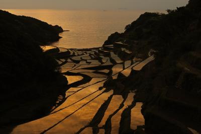 田んぼの水張りが始まる毎年4月中旬ー5月上旬まで限定で、水田が鏡面のように輝いてオレンジ色に染める:浜野浦の棚田