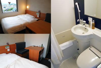 客室はリニューアルされたばかりで清潔感があり、ビジネスホテルによくある広さだけど、ベッドが横置きに配置(足元・頭側に通路無し)されているお陰で、ベッドとデスクの間はシングルベッドが1台置けそうなくらい床にスペースが生まれ、中型スーツケースを2個余裕で広げられますが、荷物を置くスペースはデスクしかありませんでした。