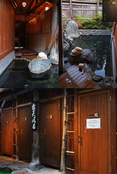 お風呂は露天風呂と内湯があり、どちらも普段は扉が開いていて、空いている状態であれば利用可能というサインなので、内鍵を閉めて貸し切り状態で利用します(特に回数指定や順番も無く自由)。
