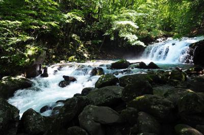 周囲は苔むした岩・張り出した木の根・落ち葉が覆い尽くすばかりで何も見えない状態がしばらく続きますが、渓流まで到着すると足場は岩が目立ち始め、雑魚川の滝の中では最大と言われる蓼科大滝が姿を現しました。