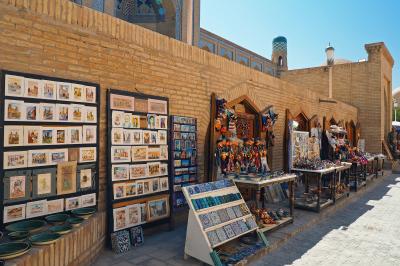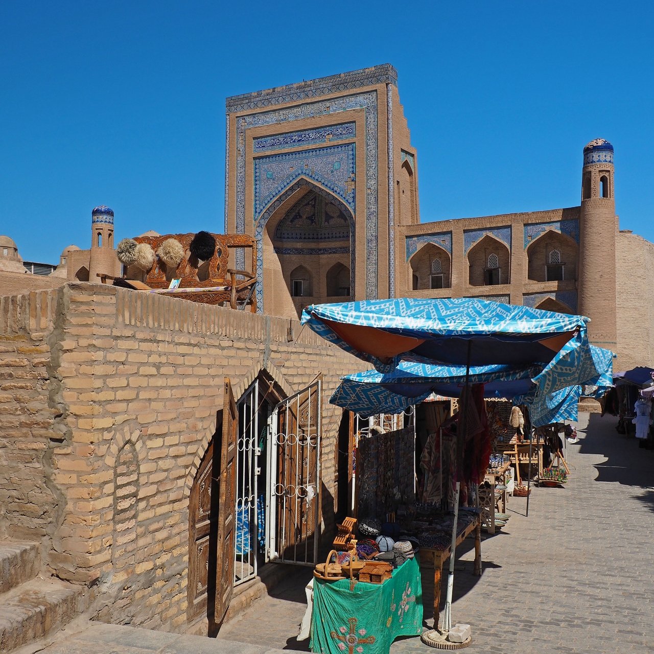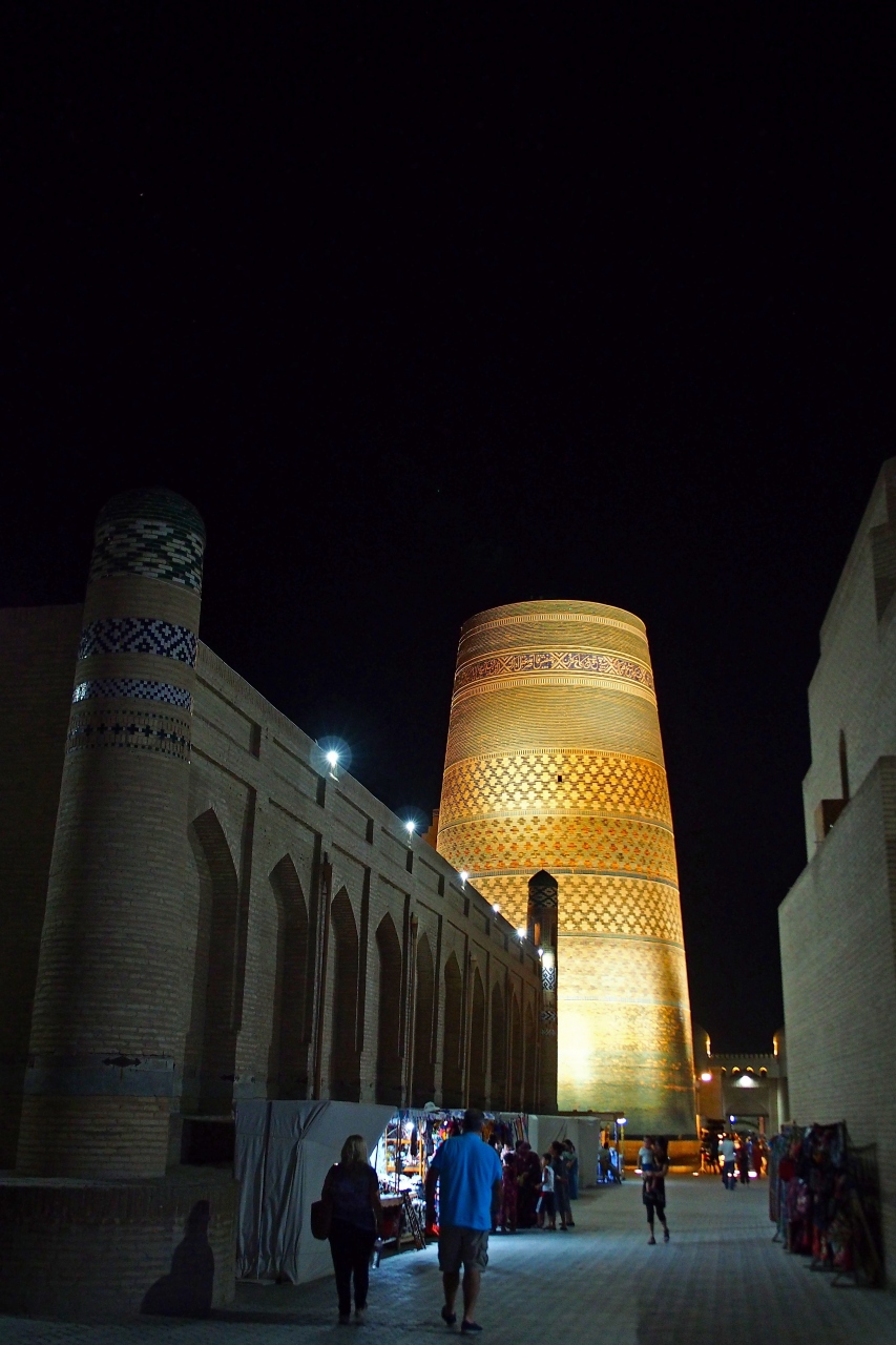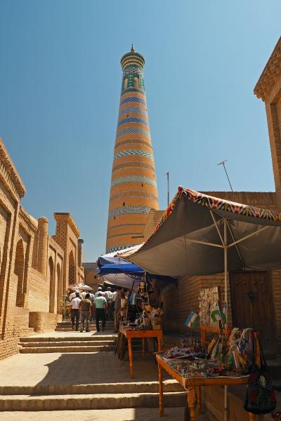 高さ45mを誇るイスラーム・ホジャ・ミナレットは、街のシンボル的存在で、ミナレットとメドレセ周辺は地元の人や観光客で溢れ、21:00頃まで土産物屋や露店が並んでいます。