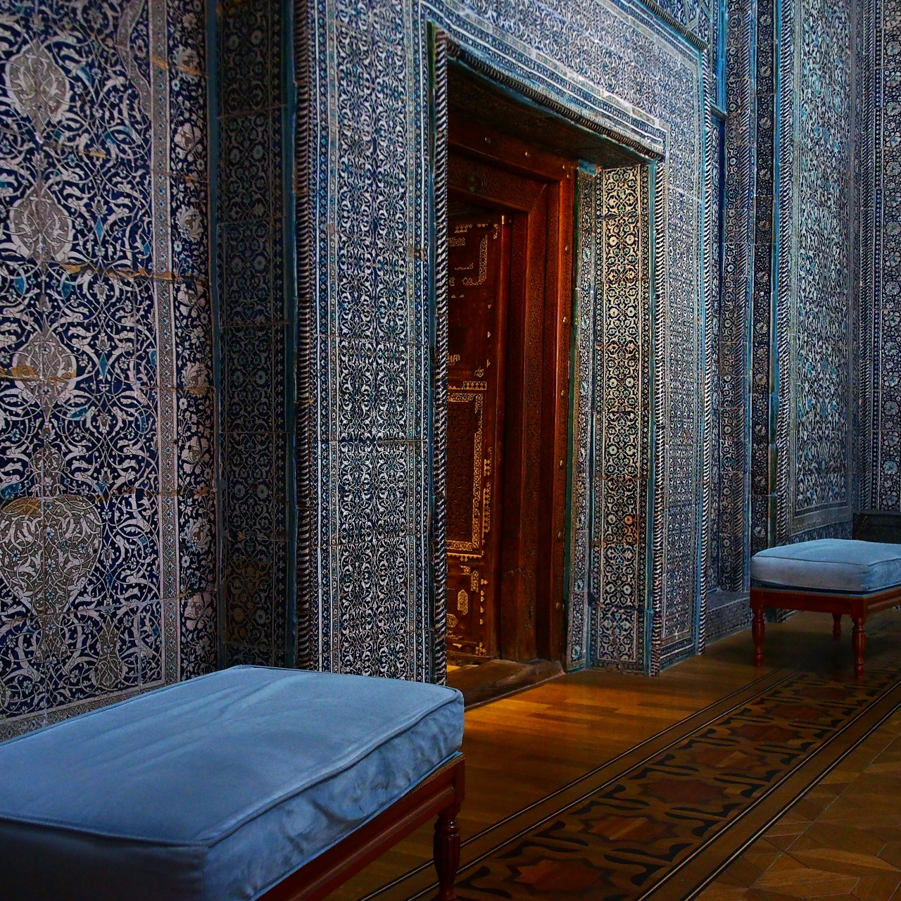 霊廟入口で靴を脱いで入ると、最初に目を奪われるのは、見渡す限り埋め尽くされた緻密なタイルと青白い世界。
