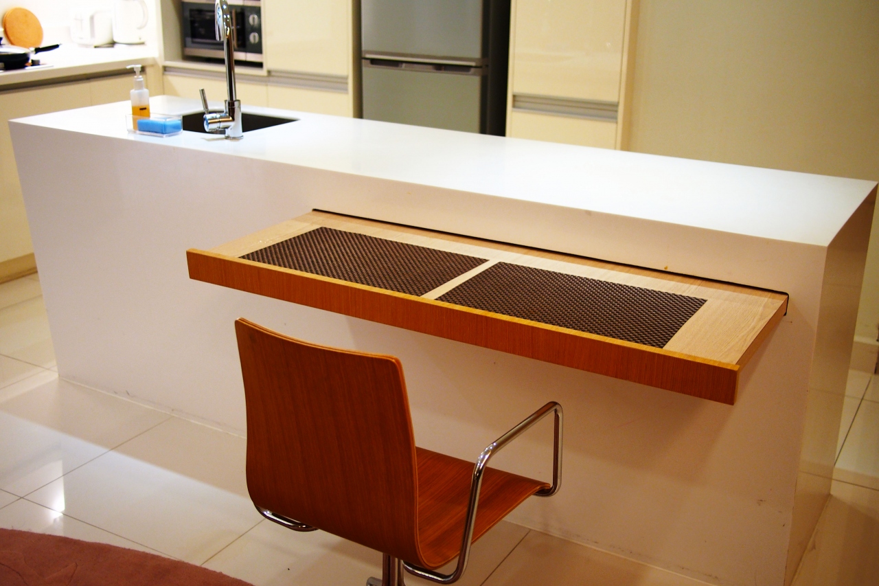 そのまま進むと、立派なアイランド式のIHキッチンがあり、カウンターがテーブルにもなるので、調理をしたり、外で購入したものを食べることが出来ます。