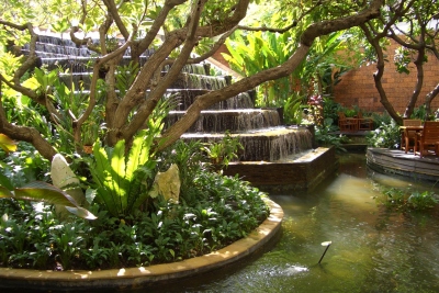 建物の中には独立したエステの入口があり、蘭の花と大理石の階段を上って行くようです。かなりオシャレで、ハネムーンサービス★★★ということでそのステキなエステ入口をバックに、ホテルスタッフが好きなポーズで写真を撮ってくれ、タイシルクの背表紙をつけて部屋に届けてくれました。