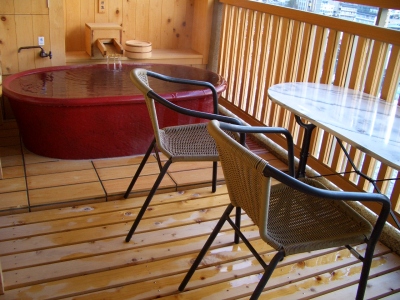 露天風呂用にバスタオルが10枚位置いてあり、身体を洗うスペースはありませんが、のぼせたら涼めるようにテーブルと椅子・それに縁台のようなモノもありました。お湯は源泉を引っ張ってきており、常時チョロチョロ・・・と湯が流れているので、いつ入っても熱々♪