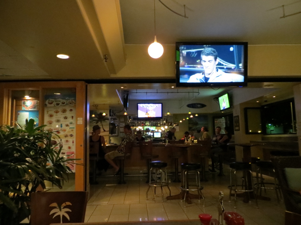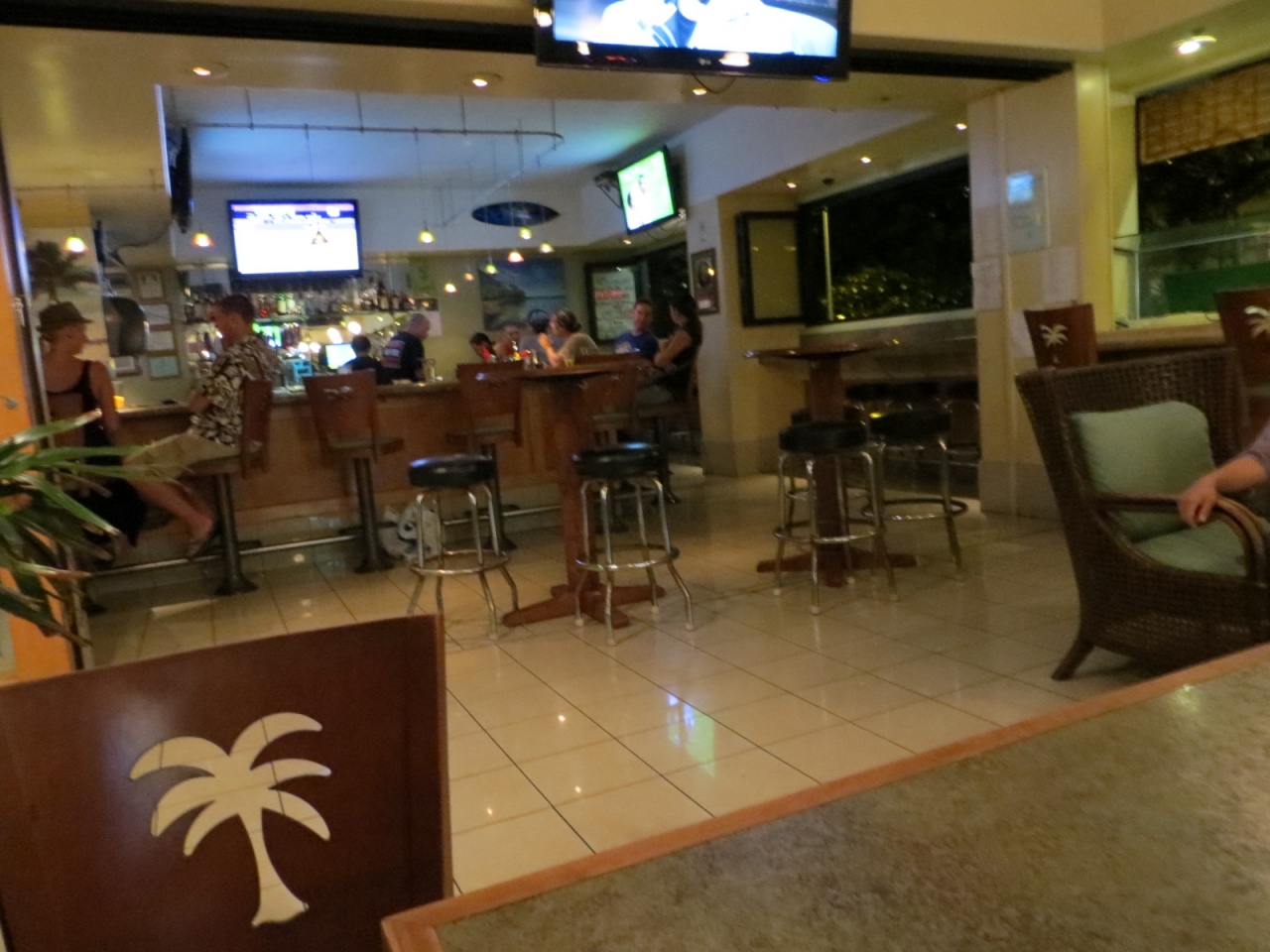 サンドビラに泊まったので利用しました。お客さんはほとんど欧米の方で一人で飲みに来てる方たちが多かったです。定員はおば様が二人いました。一瞬恐いですが凄くかわいらしいい方でした。食事物も飲み物もアメリカンな味で楽しめましたがグルメの方にはどうでしょうか。。。飲んで楽しむにはいいと思います。