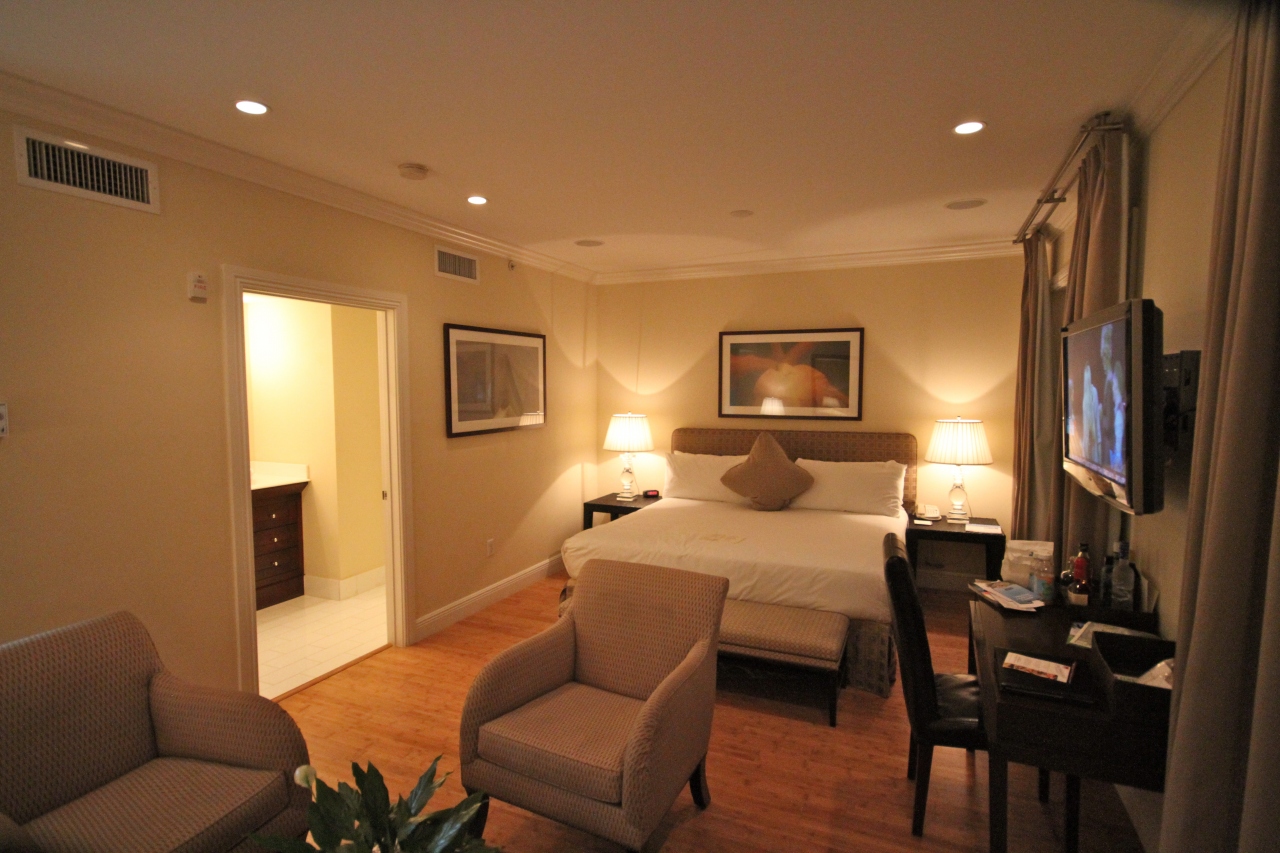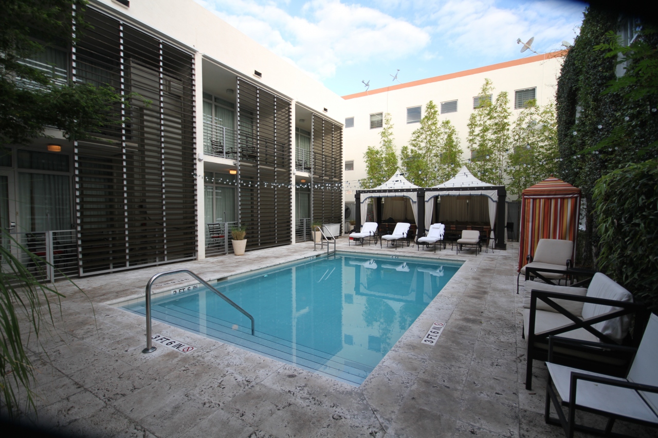 マイアミビーチのサウスビーチから5分、海から少し入った場所にこじんまりと佇むブティックホテル。いわゆる大型ホテルとは違い、部屋もソファーセットと、キングサイズベットに加えて、ミニバーやAVが完備されている。1Fの中庭に面した部屋だったため、玄関はなく、ガラス扉から出入りする、開放的な部屋。