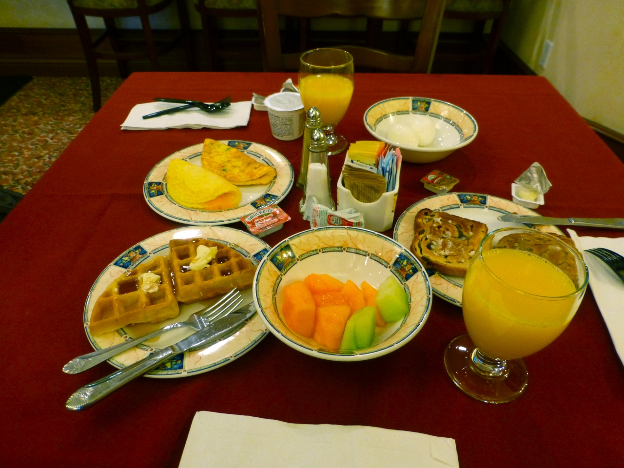 サンフランシスコに夜到着後、宿泊。サンフランシスコ市内はどこも高く、部屋も広くないのに対して、広くて清潔な部屋、バスルームで値段も市内に比べると確実に安い。そして、朝食がとても美味しかった。ワッフルは自分で焼くことが出来、出来たてが食べれる。オムレツは作ってあるものを自分でトースターで温めて食べるのだが、とても美味しかった。フルーツも種類が多い。夜到着した時には、ロビーにクッキーが置いてあり、自由に食べることが出来たが、これがまた美味しかった。