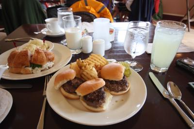 イエローストーンレイクのほとりに立つ、黄色い可愛いホテル「レイクホテル」のレストラン。ここの名物は、3種のバーガー食べ比べ。食べきりサイズの小さなバーガー3種類の中身は、イエローストーン国立公園内で見ることができるおなじみの動物のエルク、バイソン、アンテロープ。見た目と異なり、最もクセがなく美味しかったのはバイソンで、アンテロープが一番くさかった。美味しいと言うよりは、良い経験かな。
