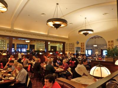 店内は広々としており、雰囲気も落ち着いている。壁には有名人の似顔絵が飾られている。サービスも行き届いており、高級店らしい雰囲気。ただ、料理が出てくるペースがゆっくりなので、パレードやショーの時間にゆとりを持って料理を楽しみたい。- 旅行時期