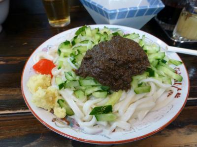 目的のじゃじゃ麺は、普通盛りでもなかなかのボリューム。こぼさないように味噌やキュウリ、しょうがをよく混ぜて頂く。この具材のバランスが絶妙で美味しい。また、カウンターには追加の調味料として、味噌は当然のこと、生姜の絞り汁や、自家製の青唐辛子の醤(ピリ辛)等が置いてあり、特に醤はオススメ。