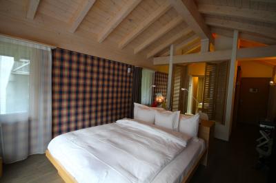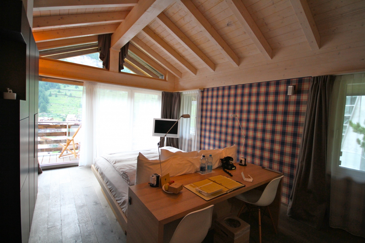 内装はチェックの壁紙と木のぬくもりを感じるスイスらしいおしゃれな雰囲気。「マウンテンブティック」のイメージがぴったり。お風呂の湯船が同一フロア内にあるのが気になる人は気になるかも。アメニティや設備も充実しており、次に来る機会があればテラスからのマッターホルンをお供に、リゾートステイをゆっくり満喫したい。