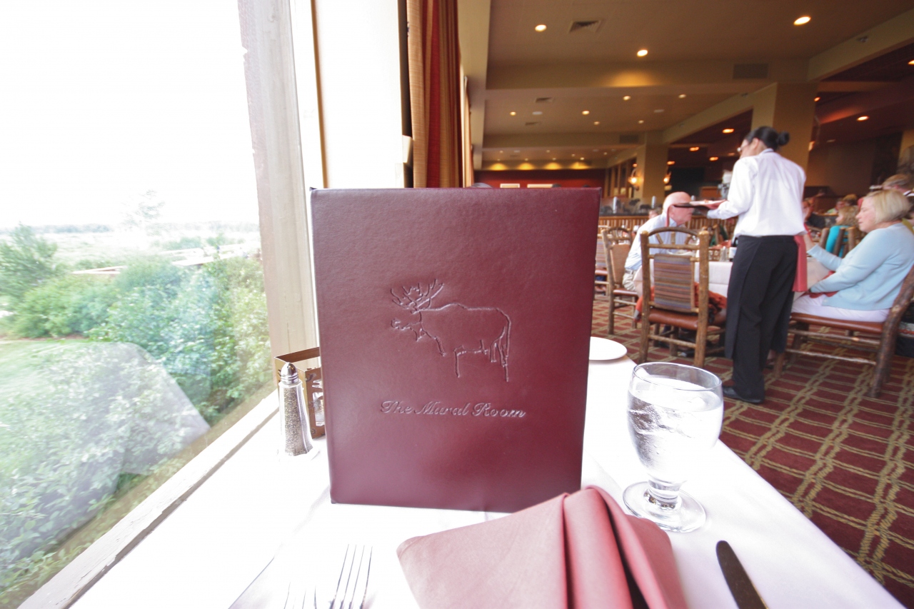 グランドティトン国立公園内の有名ホテル、ジャクソンレイクロッジにあるメインレストラン。窓の外には雄大なティトン山脈とその手前で牧草を食べる野生の動物が見られる。サービスも一流で、お値段も少々高め。