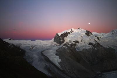 夕方は夕日に照らされるモンテローザ、リスカム、ゴルナー氷河が有無を言わさず美しい。マッターホルンと違い、丸みを帯びた山容に温かみのあるオレンジのライトアップ。