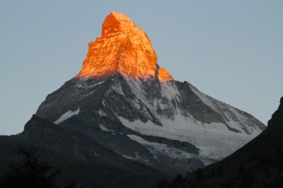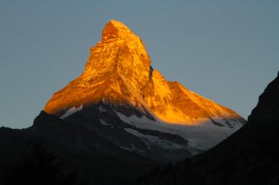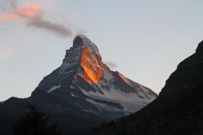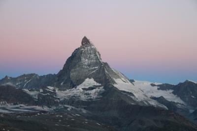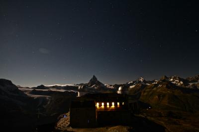 朝は、東壁を正面に向けたマッターホルンを真正面から照らす朝日。尖った山容は燃えるような赤に染まる。そして、夜中。漆黒の空に輝く星と月に照らされた山々。写真に取ると現れる幻想的な姿は、月の明るさによって全く異なる表情になるのではと思う。