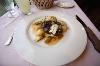 テンダーロインとリブステーキを食べたが、どちらも柔らかく、赤く染まる空とティトン山脈を見ながら忘れられないディナーとなった。