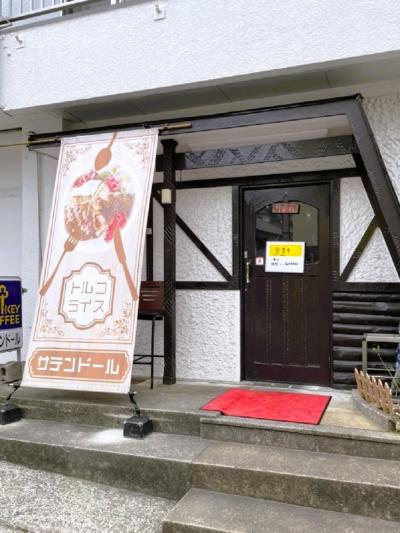 場所は市街地・中央橋から路線バスで20分ほど三原地区の寺井田バス停下車、徒歩で直ぐのところに在る普通の喫茶店で、店頭にトルコライスの写真入り大幕が有るので迷うことは無く判り易いです。