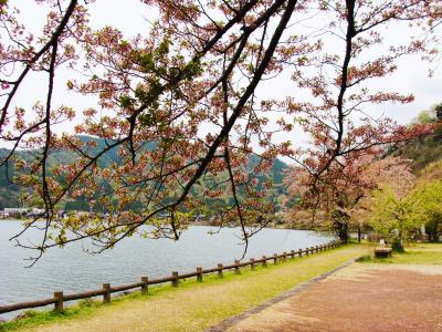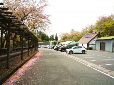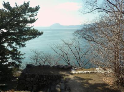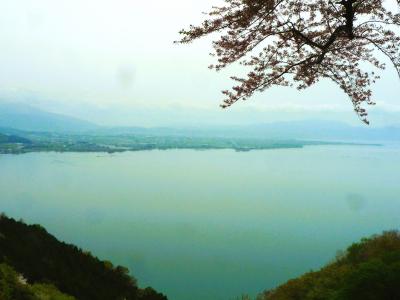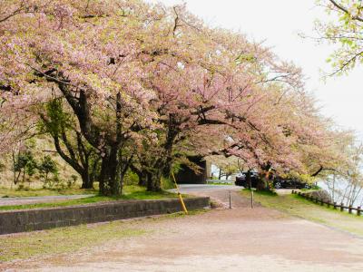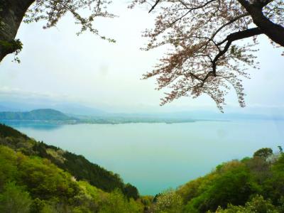 実際に展望台からの眺望は奥琵琶湖と賤ケ岳の山々が眼下に広がる雄大な景観です。季節的には斜面に植樹された桜の花が満開で暖かく春爛漫でした。