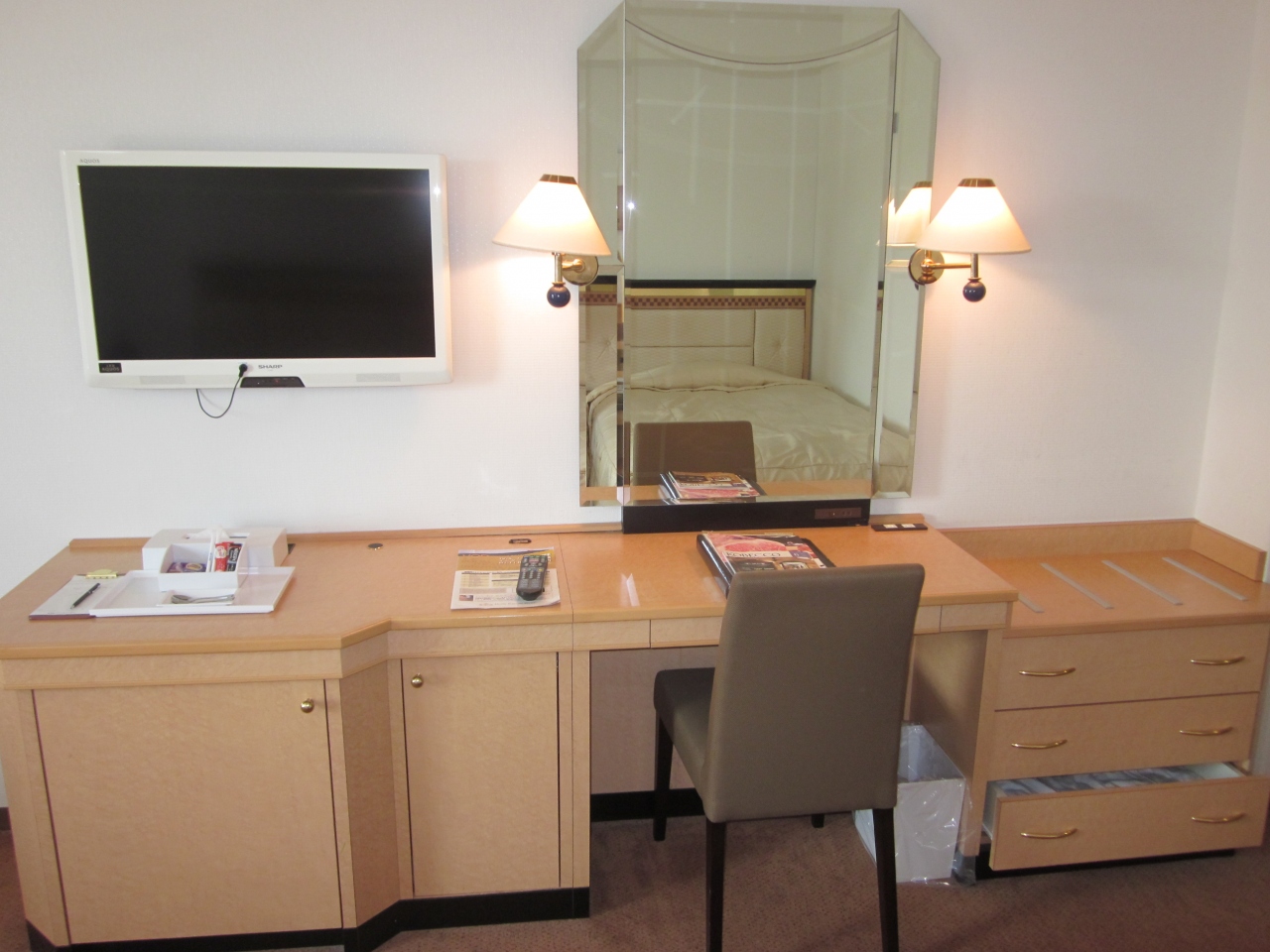 設備もA/C・ミニ冷蔵庫・大型液晶TVに湯沸かしポット、アメ二ティーも石鹸・シャンプー・歯ブラシ・タオルと一通りは揃ってます。