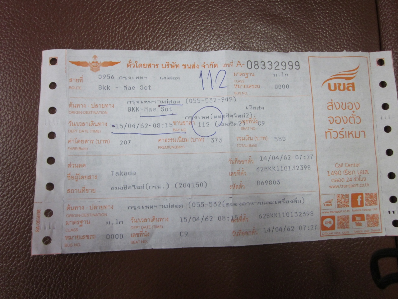しかし、メーソート行きは満席売り切れの為、翌日の便に成りました、付いてないです!…。