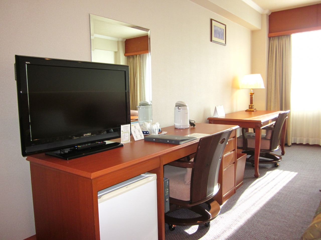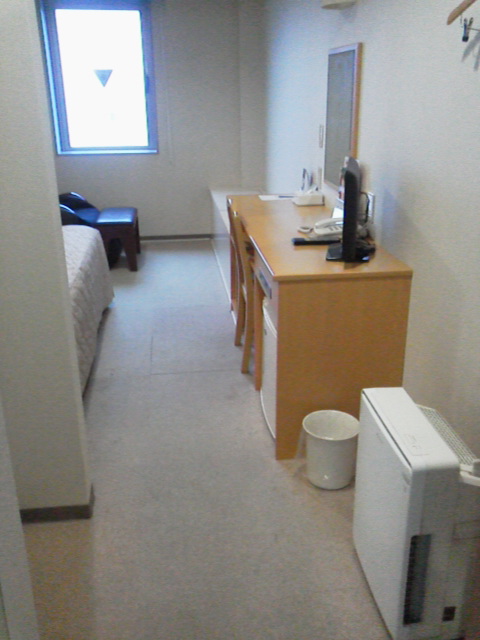 部屋は意外に広くてシンプルで飾り気無しの窓も小さ目。デスクと長くて広い荷台と冷蔵庫、小型の液晶TVに湯沸しポットに空気清浄機が備え付き。