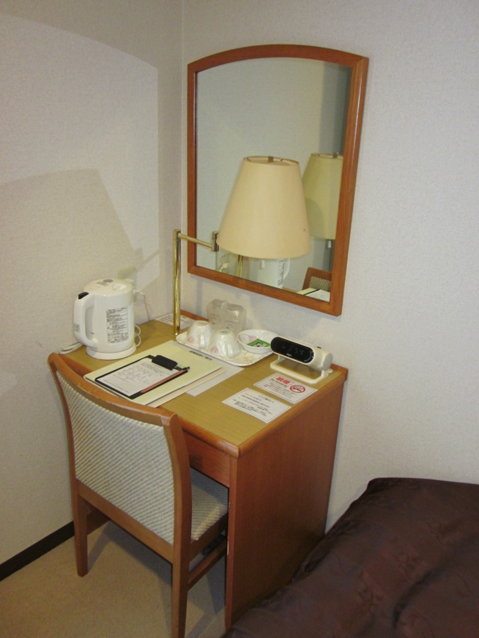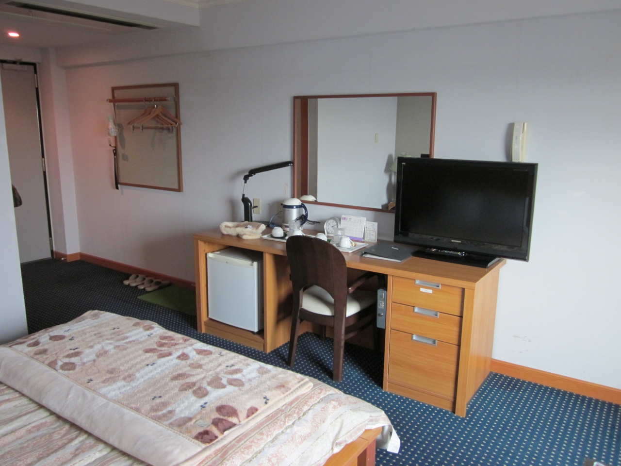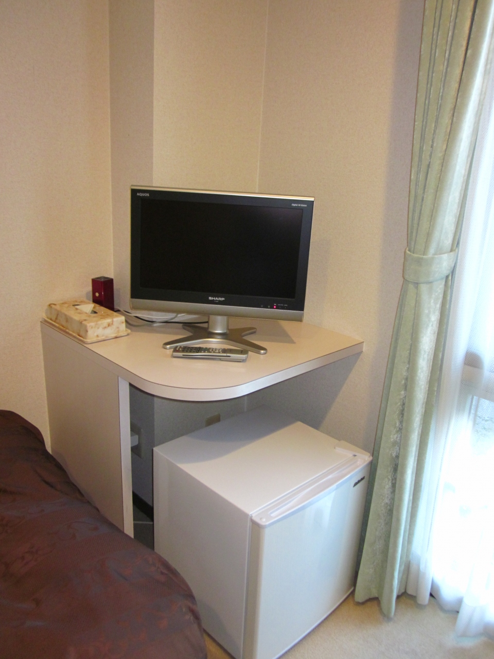 部屋はごく普通でベッドはシングルタイプ、ミニ冷蔵庫や小型液晶TV・ドライヤー・ネット環境、アメニティなど一般的なものは揃ってます(ネットはランケーブル)。