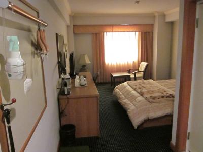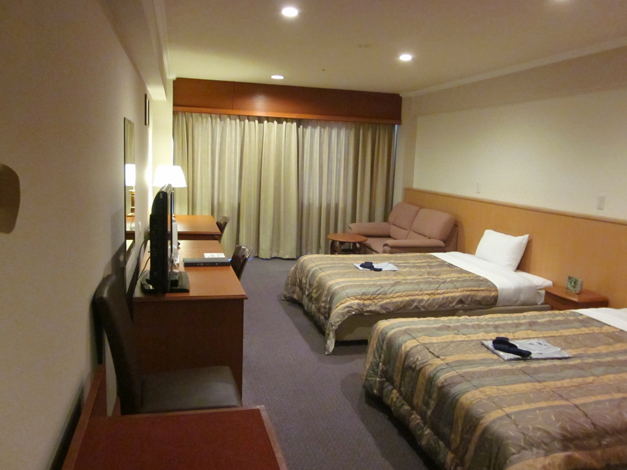 で今回予約したのは「エコノミーツイン・禁煙室」~、部屋に入って驚いたのは広さがシングルと全く同じ?…、そこにシングルベッド×2台有るものだから狭い!。