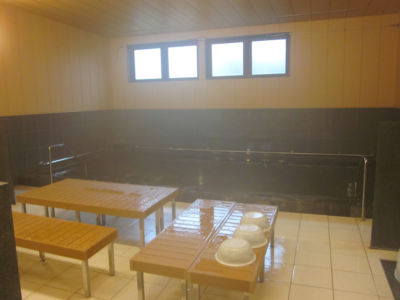 内風呂だけのシンプルな湯舟ですが、源泉掛け流しの湯が並々と溢れてます!。無臭・無色で肌さわりも特になし?、ラドンだから仕方がありません。