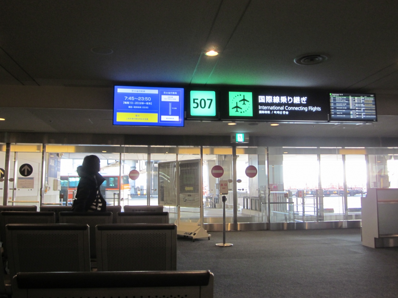 時間短縮は当然ですが、歩く距離も随分と短く成り、実に良いサービスですね!~、連絡バスは空港敷地内を走るので、窓から見る景色も普段見ることが出来ないので楽しさもアップです。
