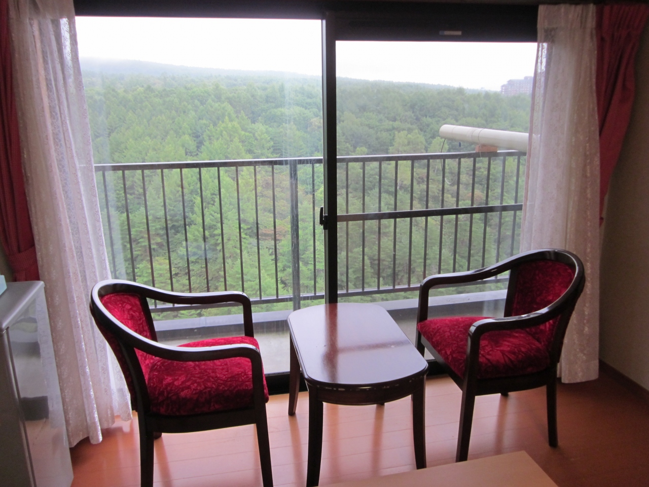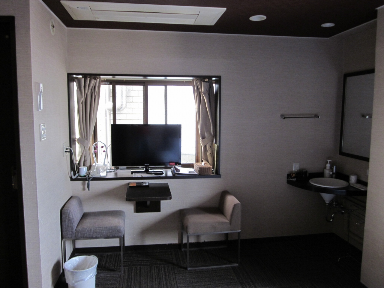 窓も小さくて~外は直ぐ本館の部屋や壁が有るので、カーテンをしないとお互いに丸見え状態で落ち着かない?…、その前にТVが有るので更に圧迫感が有ります。