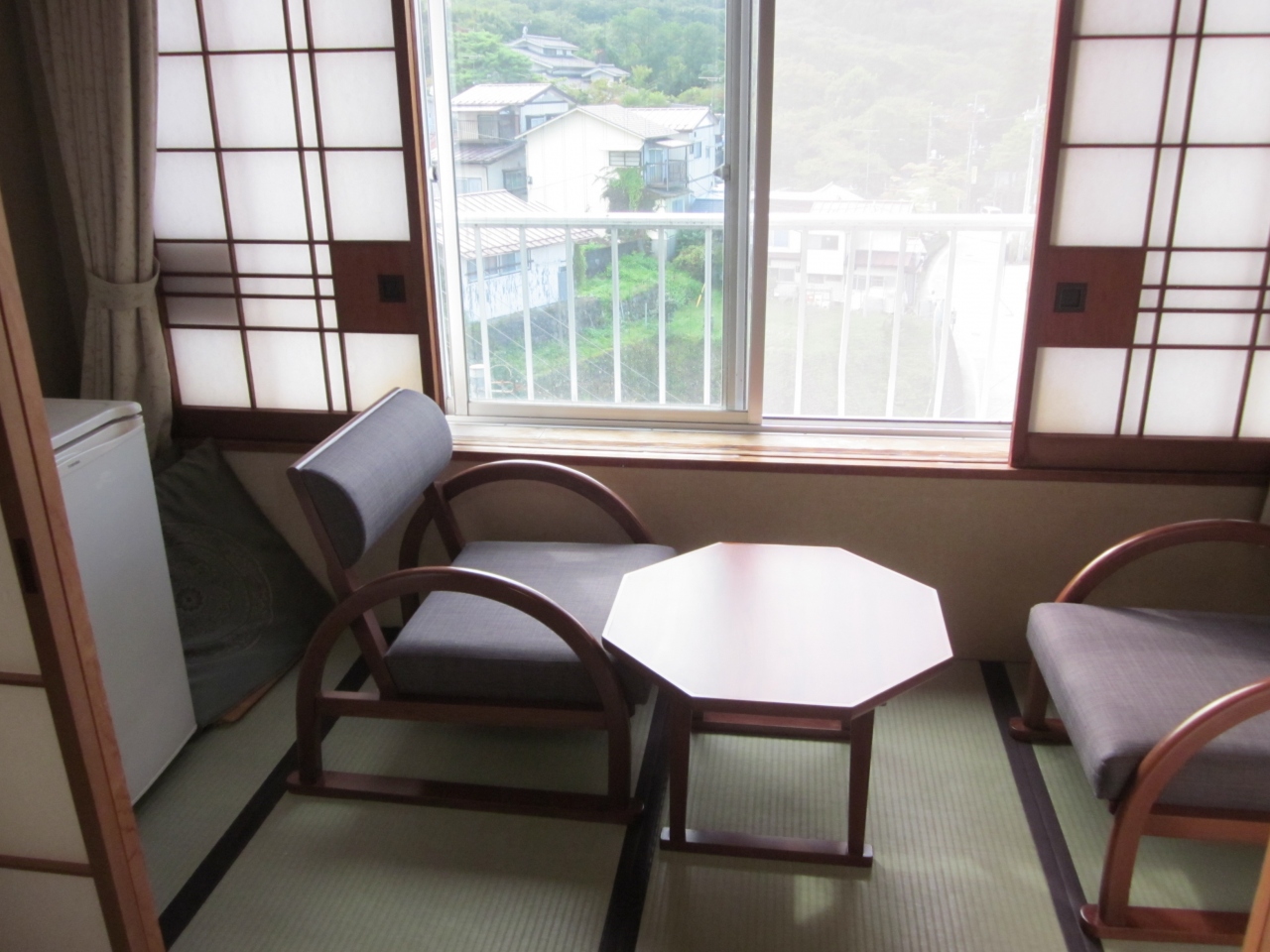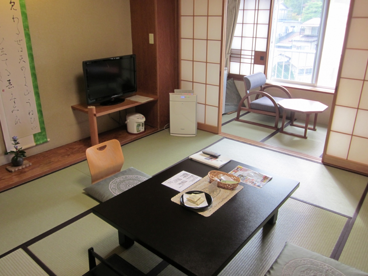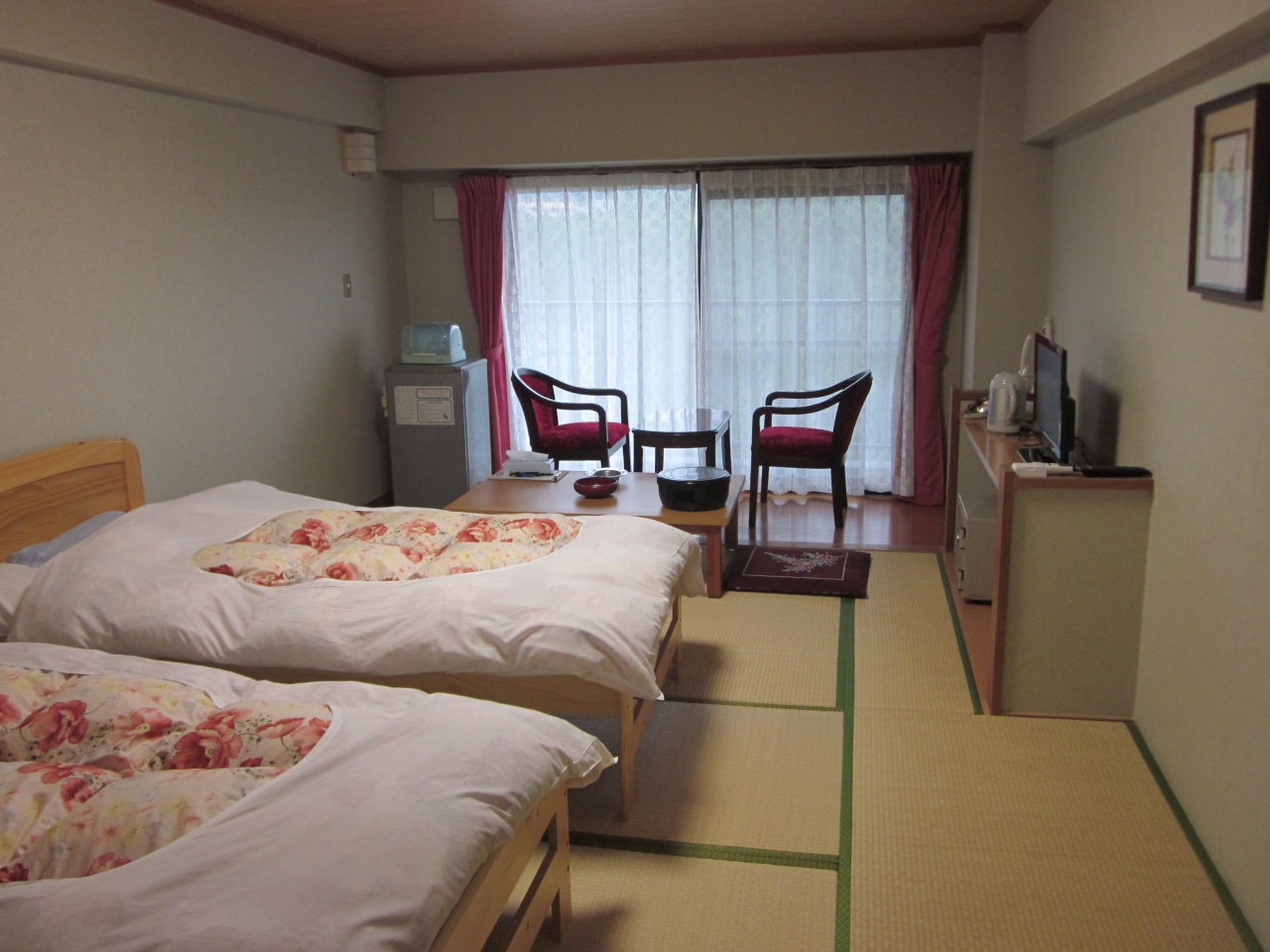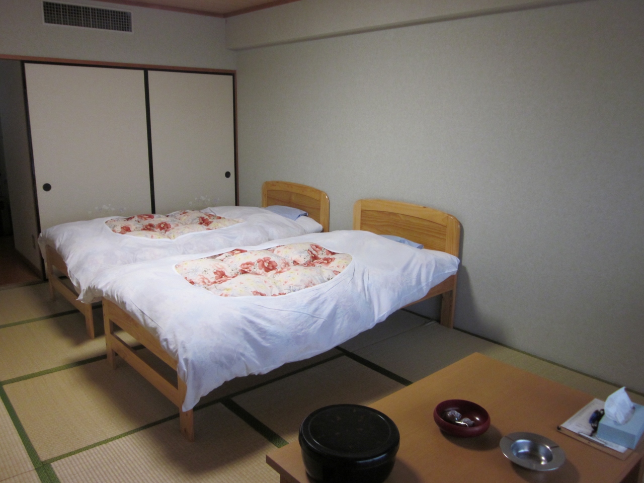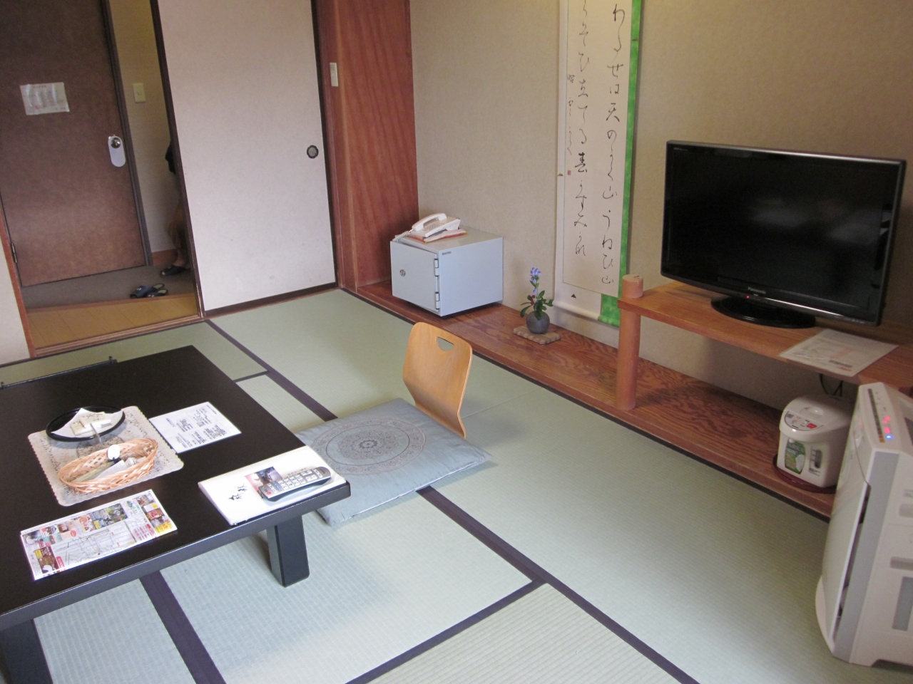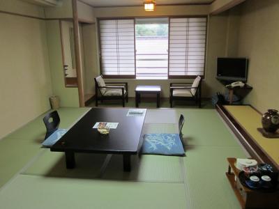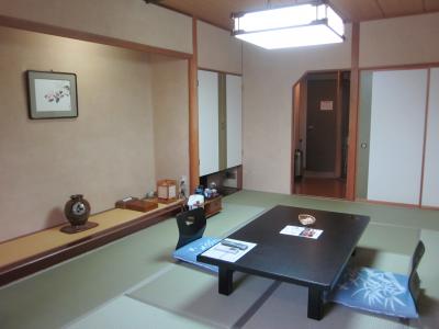 部屋は至って平凡な和室8畳の造りにバス・トイレ付き~、ゆったりとした造りで好いのですが、一部壁紙が擦れて破れているのは問題有りですね!~、これで宿の印象がグーンと下がります。