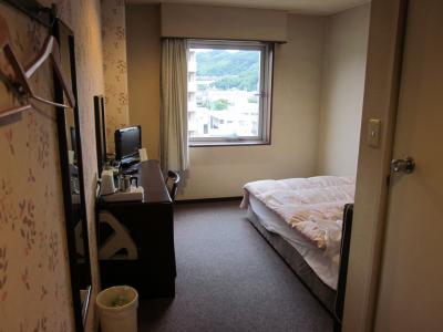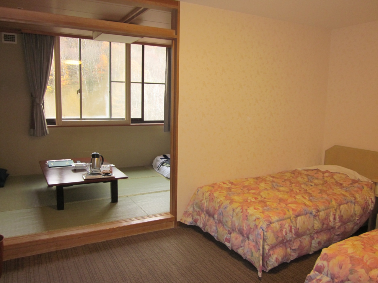 予約の際にリクエストしておいた最上階の端部屋を頂き、大きな窓からは紅葉の山々が秋の深まりを感じさせますが~、和洋室はコンパクトな造りで使い勝手が悪い中途半端な4人部屋?~、施設が古いので仕方が無いのかも知れません。