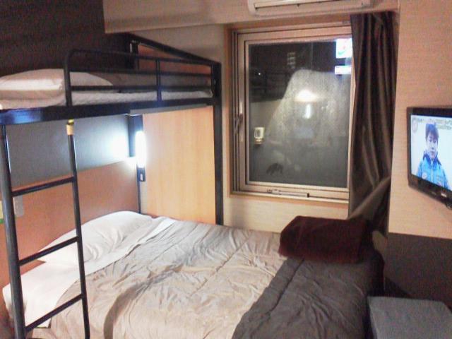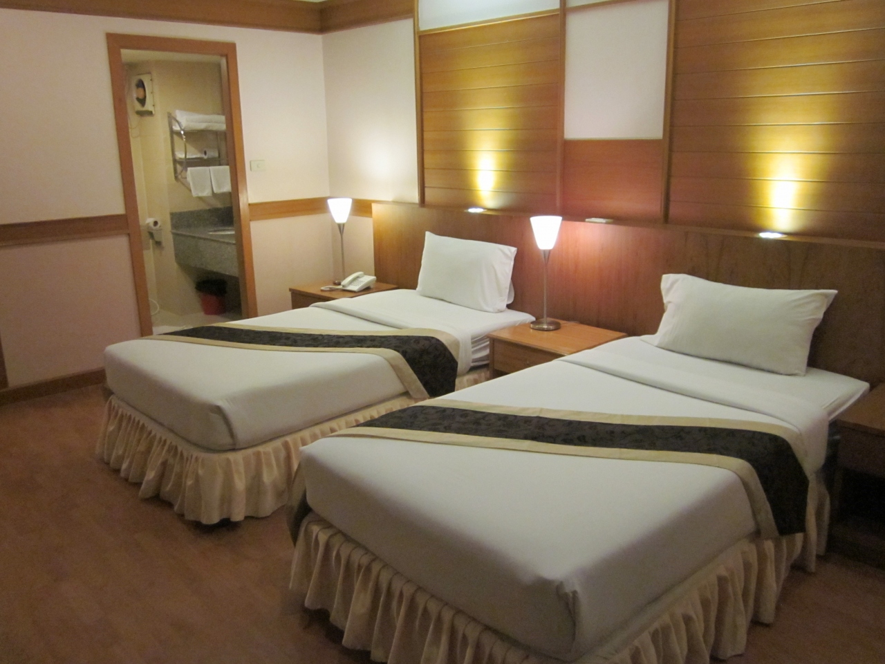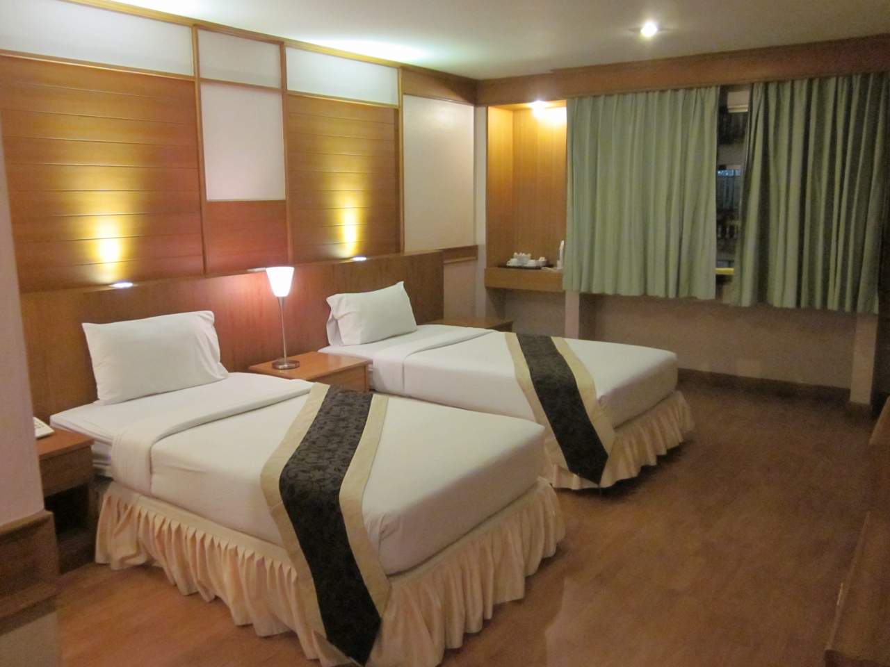 部屋はスタンダード・ツインで普通の広さで床はフローリング、壁はウッド調で間接照明を施した明るい感じです。ベッドや家具、ミニ冷蔵庫にテーブルデスクと椅子、大型液晶TVに湯沸しポットに至るまで新しい物が使われています。