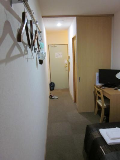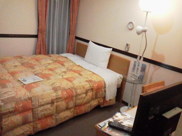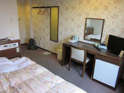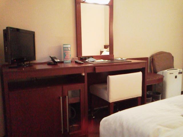 部屋はごく標準的な広さ~、喫煙室でしたので煙草臭い。柔らか過ぎるベッドと塗装が剥げたデスクに荷台、ミニ冷蔵庫に液晶ТVにポットなどの備品が揃ってます。