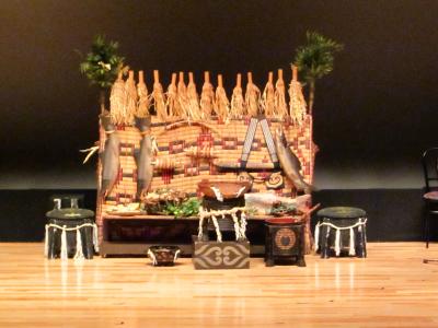 舞台中央には祭壇が祭られて~、松明を燃やしながら森の神をアイヌのコタンへお導き入れ、神々への感謝を祈り五穀豊穣を願う踊り。所々に語り部も混じりながら、アイヌの人々の思いや自然と共に生きて来た民族であることが理解出来る内容でした。