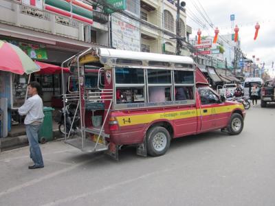もっとも一般的なのは小型ローカルバスが本数も多くて便利で、一番安いTHB39!。しかし、ボロなので揺れて窮屈で腰が痛くて体にきます!?~、季節によれば暑くて通称「走るサウナ」と言われてます。