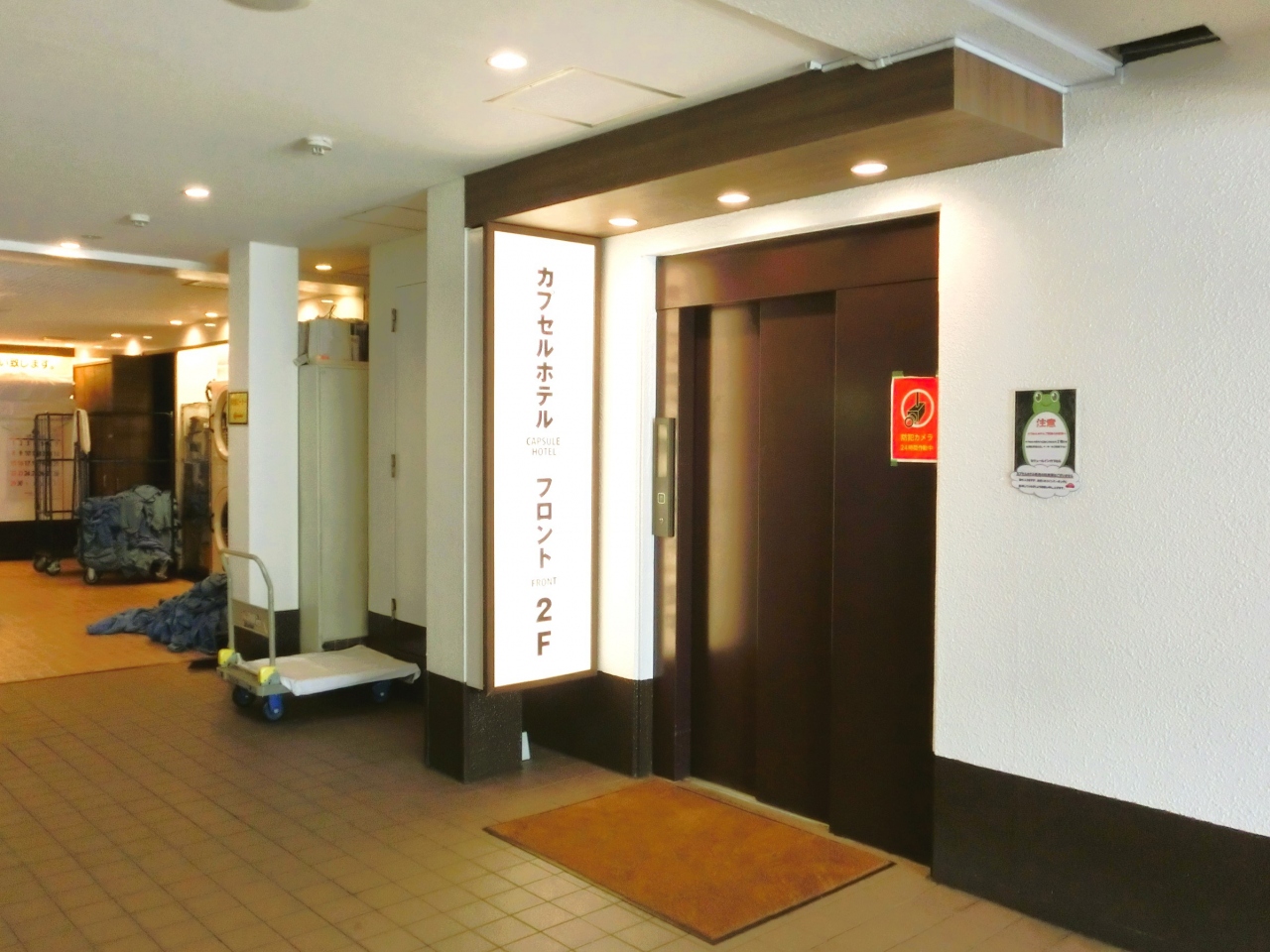 外観からして賃貸ワンルームマンションの低層階部分をカプセルホテルとして利用、フロントは2階で部屋は3~5階で4種類のカプセルで今回はスタンダードタイプの下段を利用。