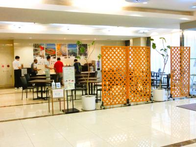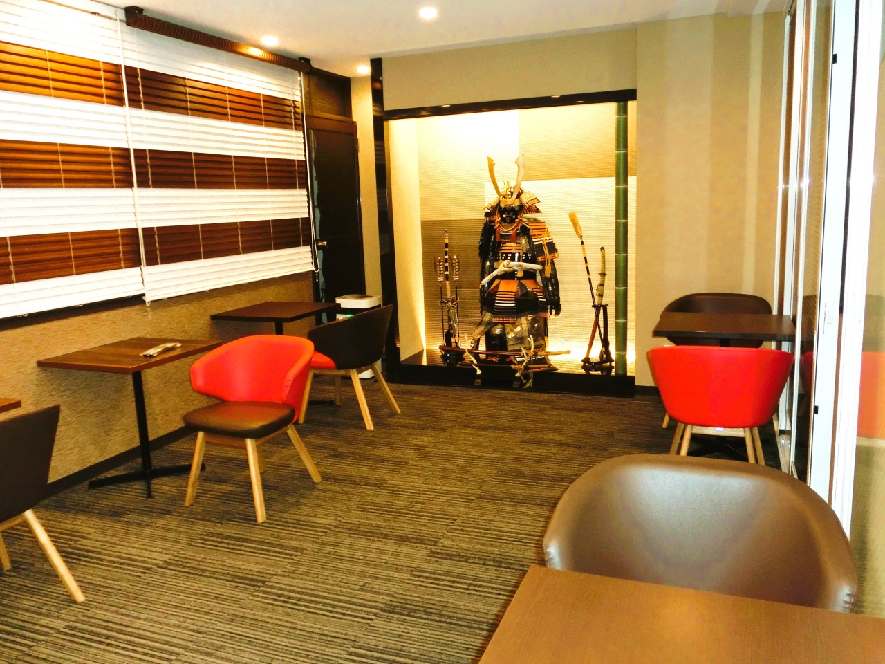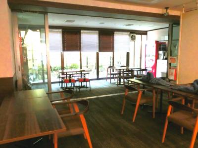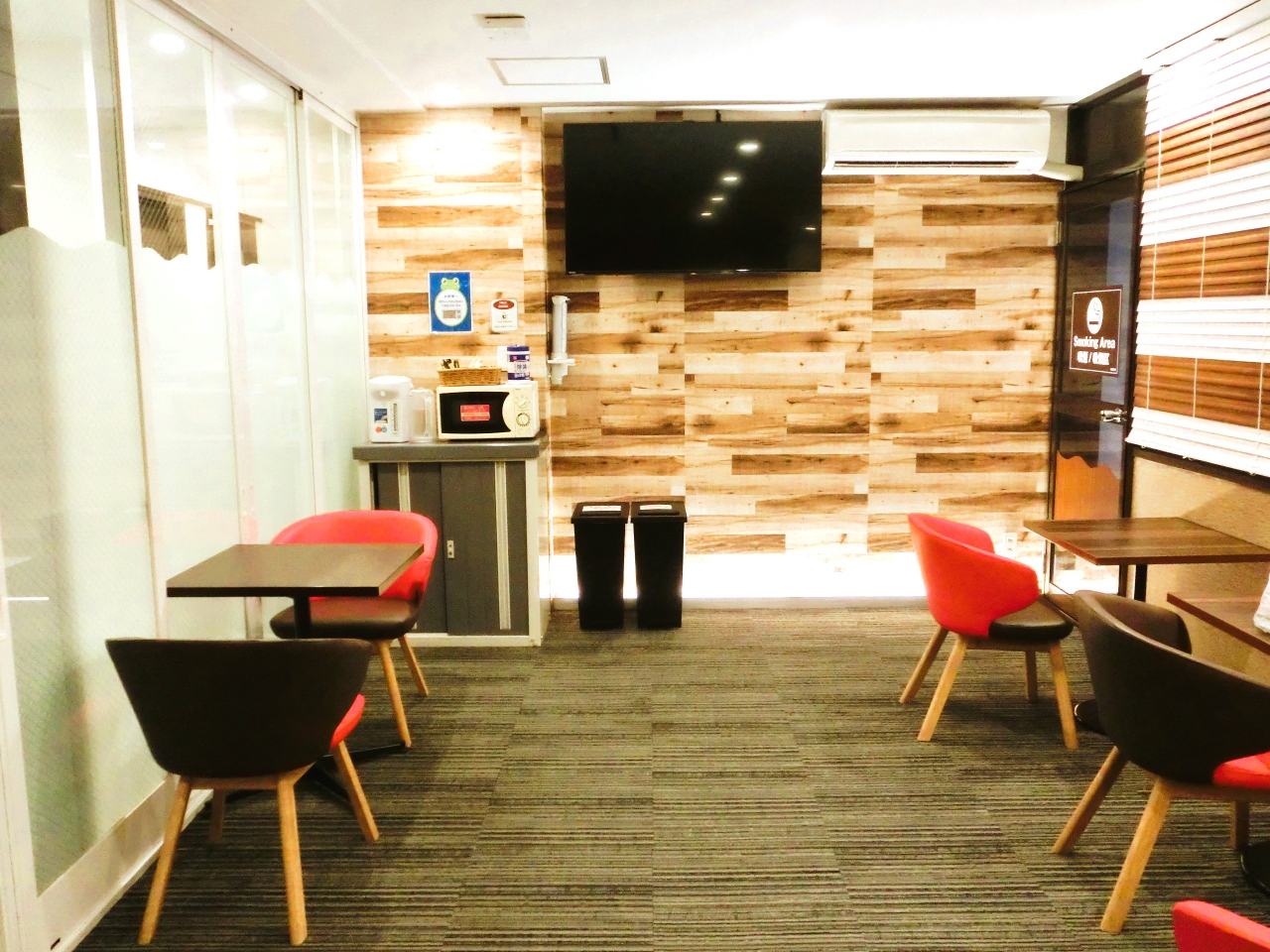 フリースペースにはウエルカムインスタントコーヒー・緑茶・冷水・温水有りでレンジと給湯ポットも在り、大型TVで視聴も可能です(喫煙室はベランダです)。