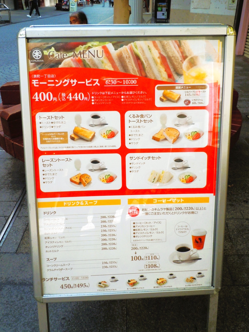 市内の表町商店街に在る「キムラヤのパン表町一丁目店」で数十年ぶりにモーニングをいただきました。