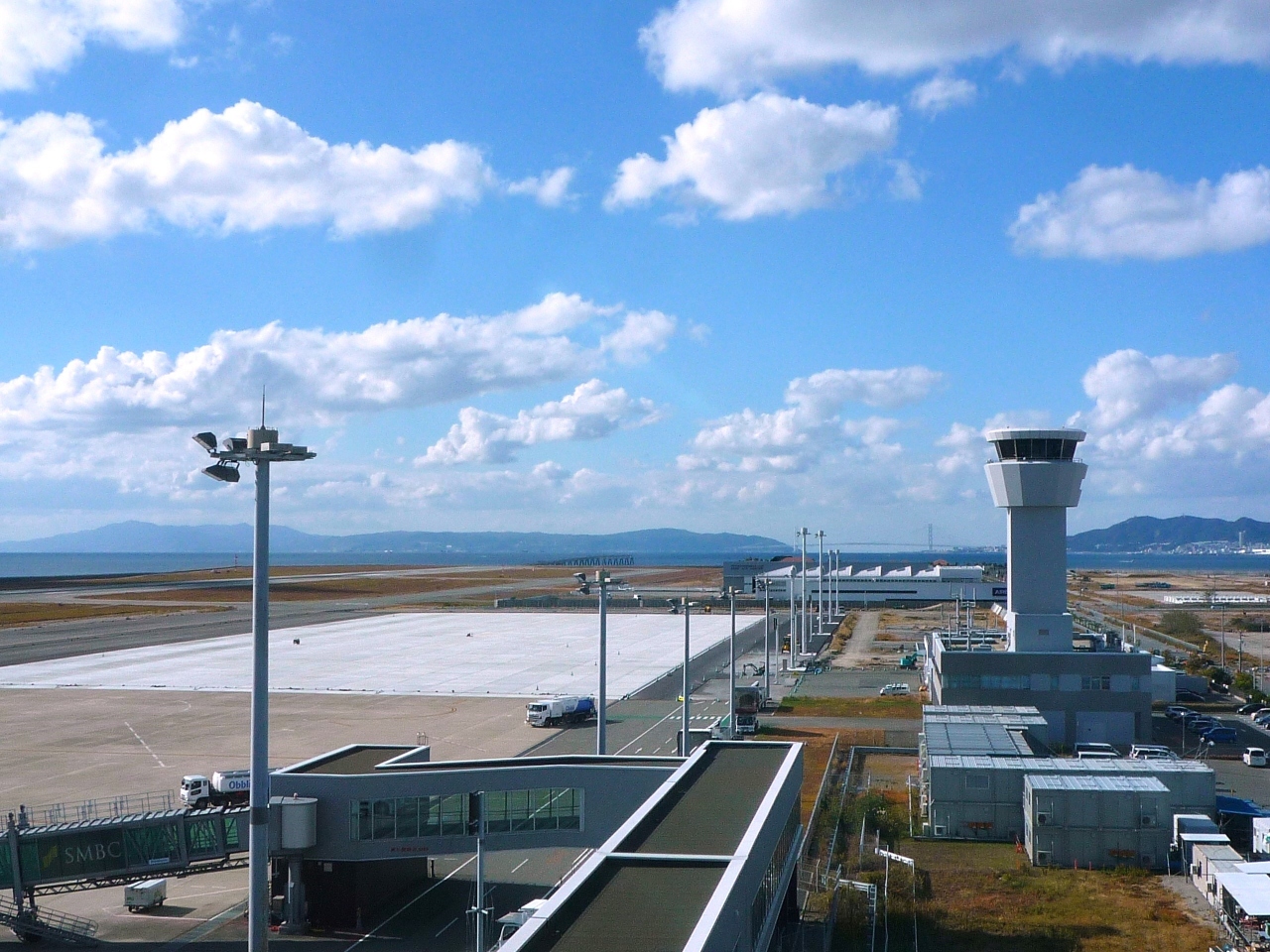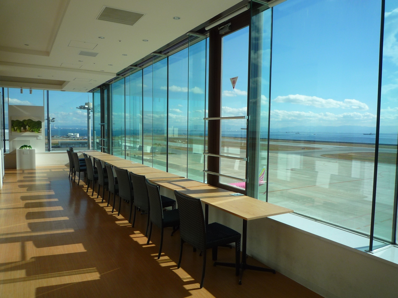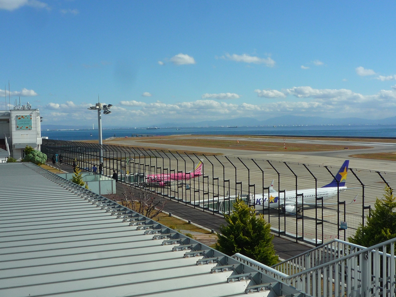 前にはエプロンと滑走路が在りその向こうには大阪湾が広がりフェリーや貨物船・タンカーが航行する飛行機と船舶のダブル景観が楽しめる。