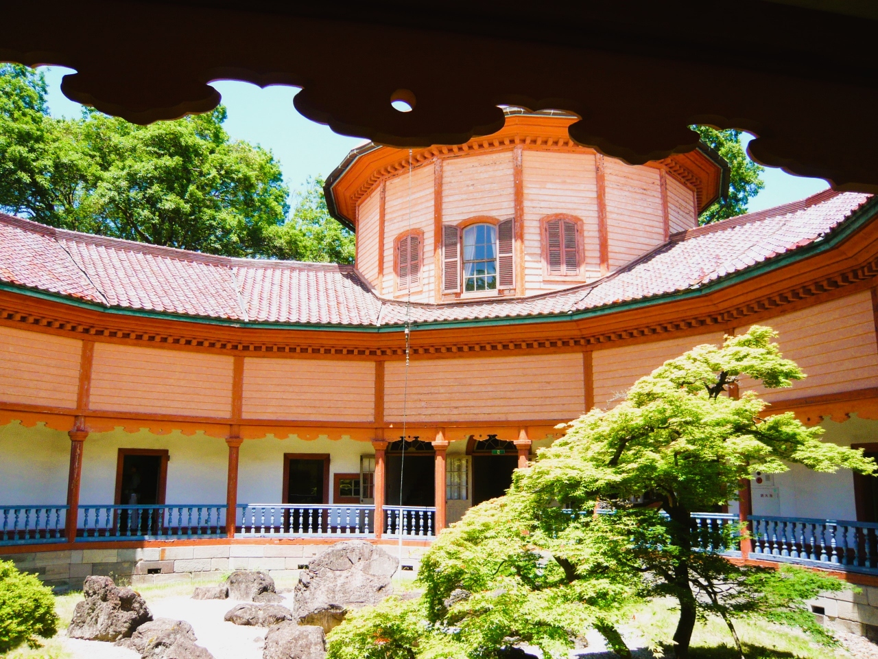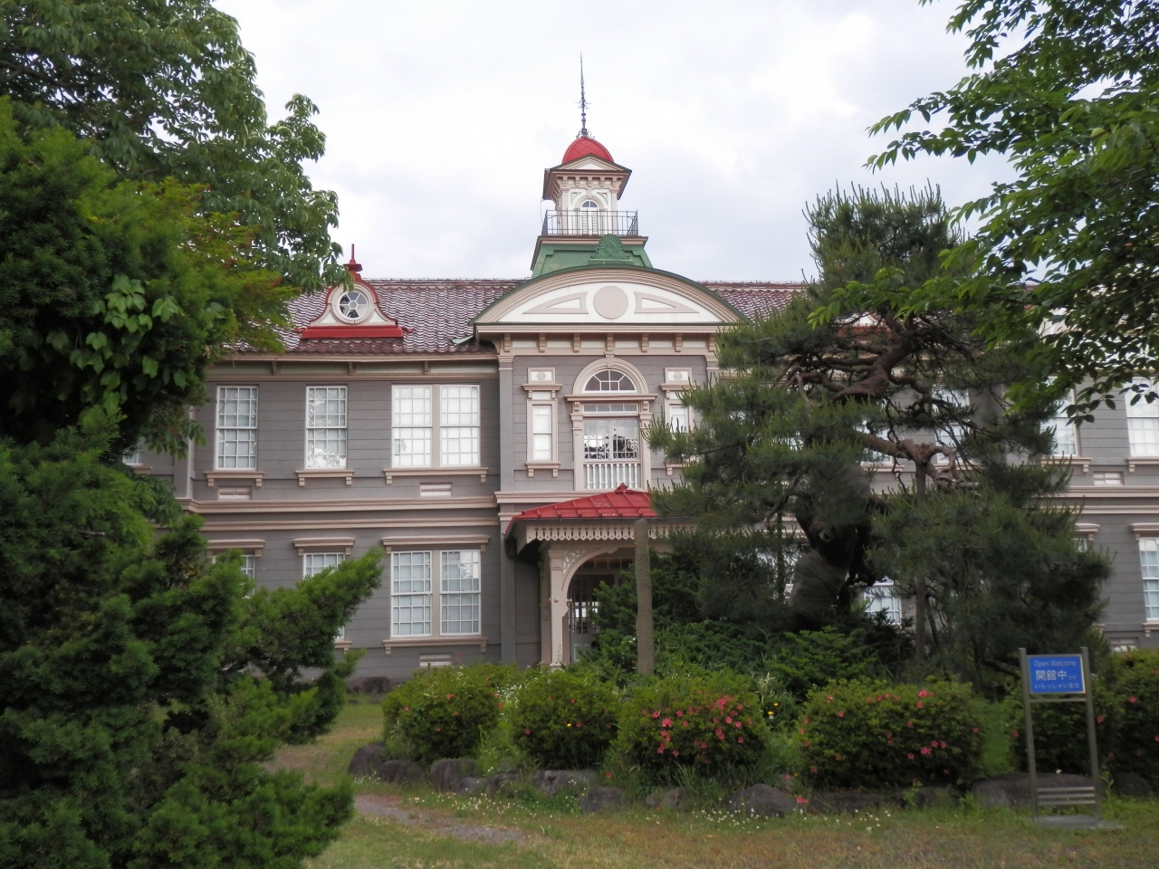 霞城公園内の木立にすっかりと馴染んだ「旧済生館 本館」は緑に映えるデザインと色彩が文明開化の象徴として建築され明治の最高傑作です。