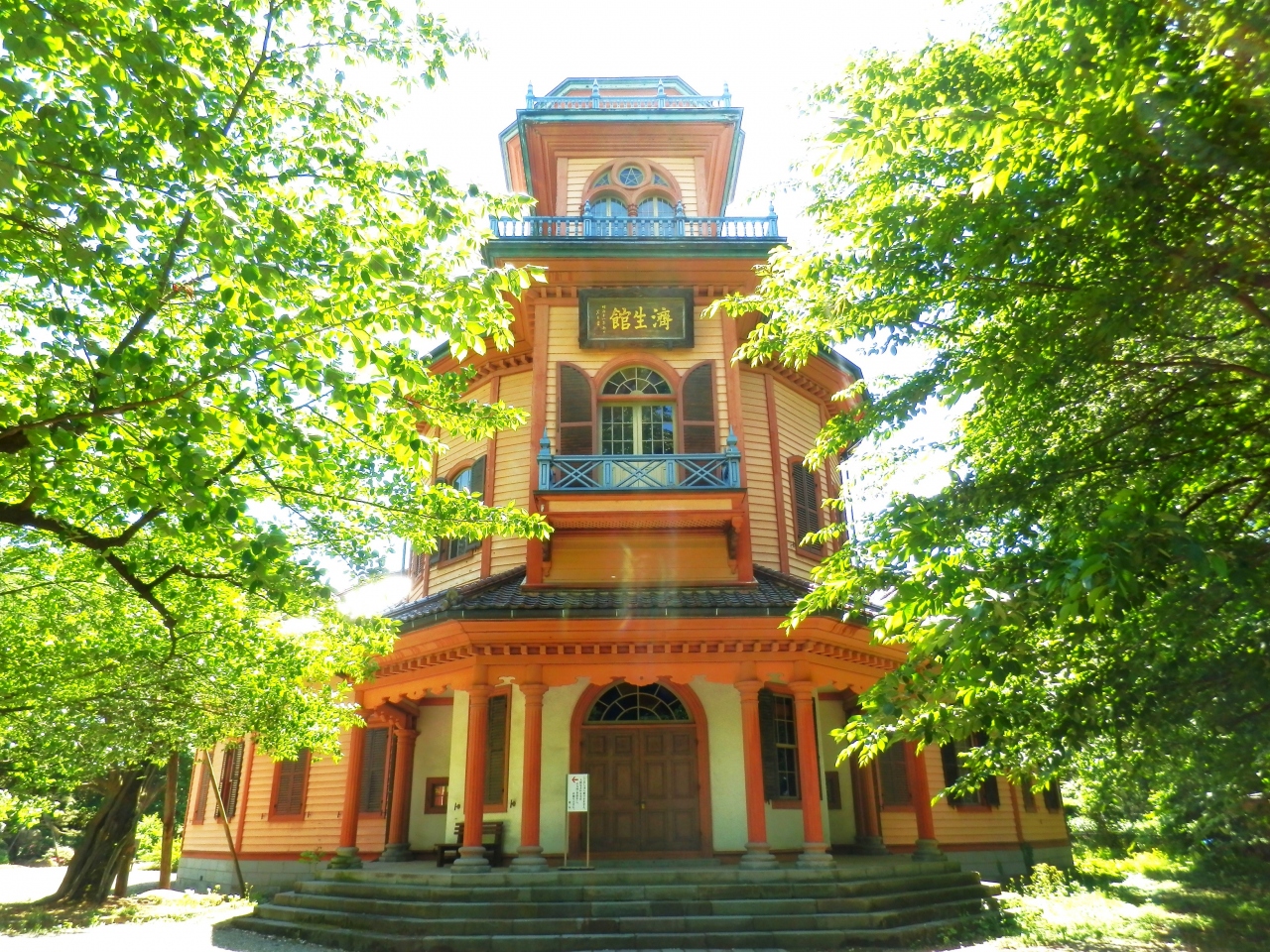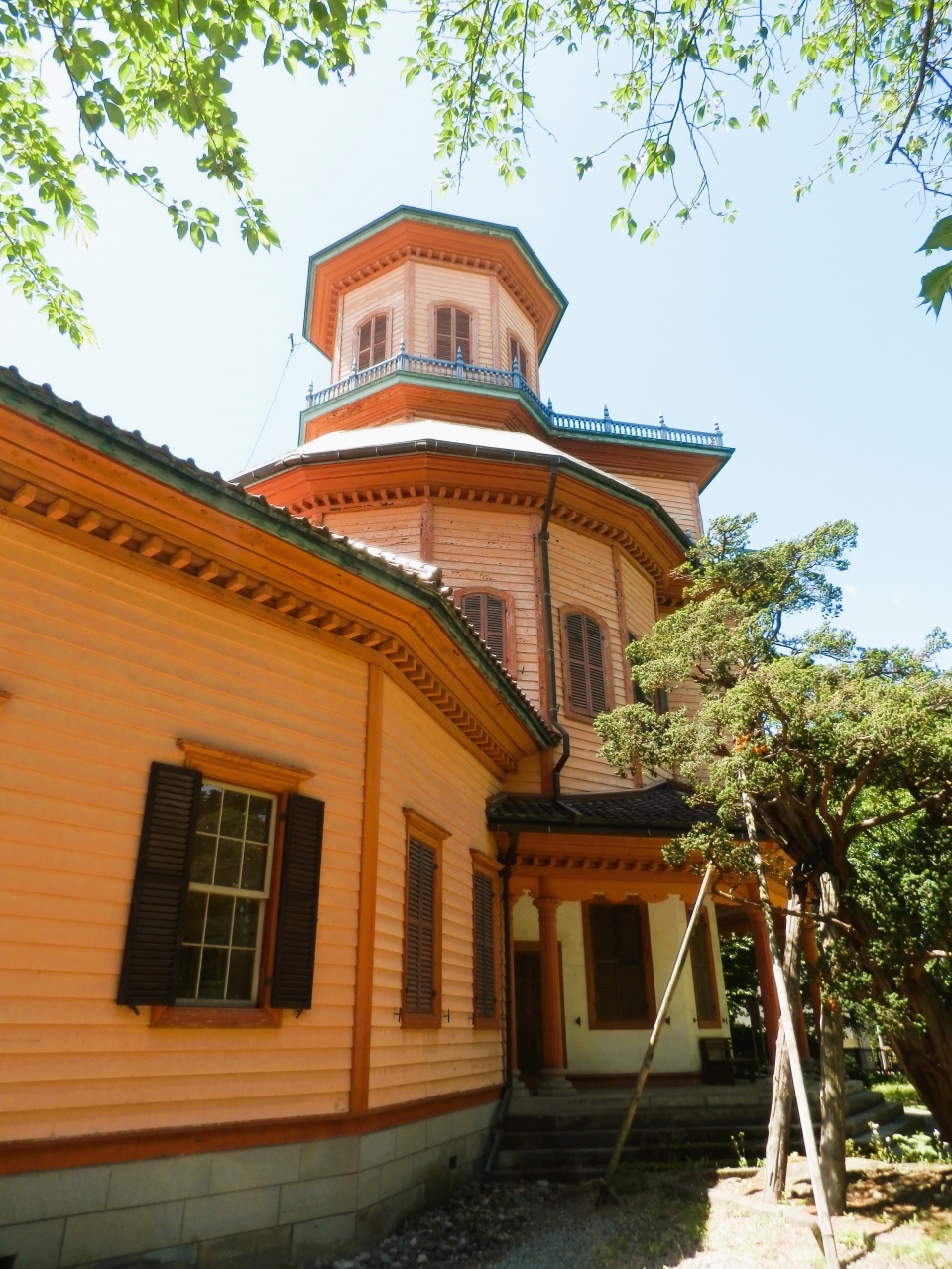 1階の正面玄関は八角形のポーチで、2階は十六角形の大広間・講堂、螺旋階段で3階の八角形の小部屋とそれぞれの階にベランダを配した構造は木造3階建て擬和洋中風の建築。
