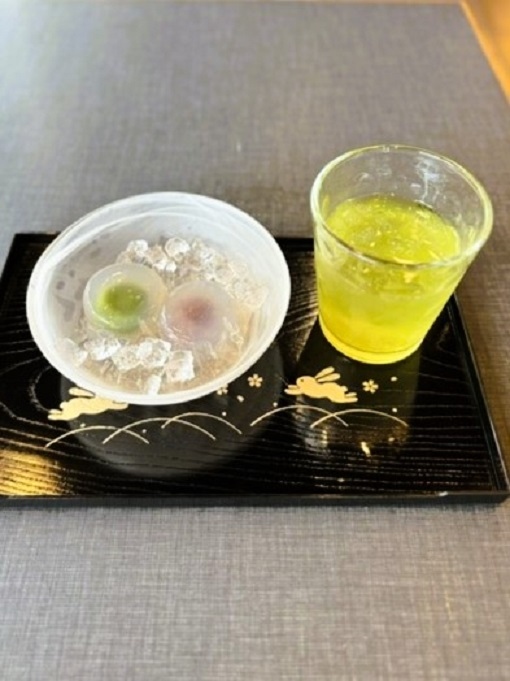 店内でも水まんじゅう2個と緑茶のセット¥450、3個セット¥590でいただけます。