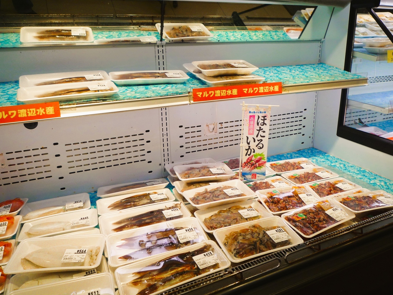 この季節なので浜坂漁港で水揚げされるホタル烏賊があれば欲しいなぁ?そう思ってマルワ渡辺水産の冷蔵ケースを見れば有りました…、生の状態でパック詰されて¥300前後なので大阪の半額ぐらいでしょうか?。