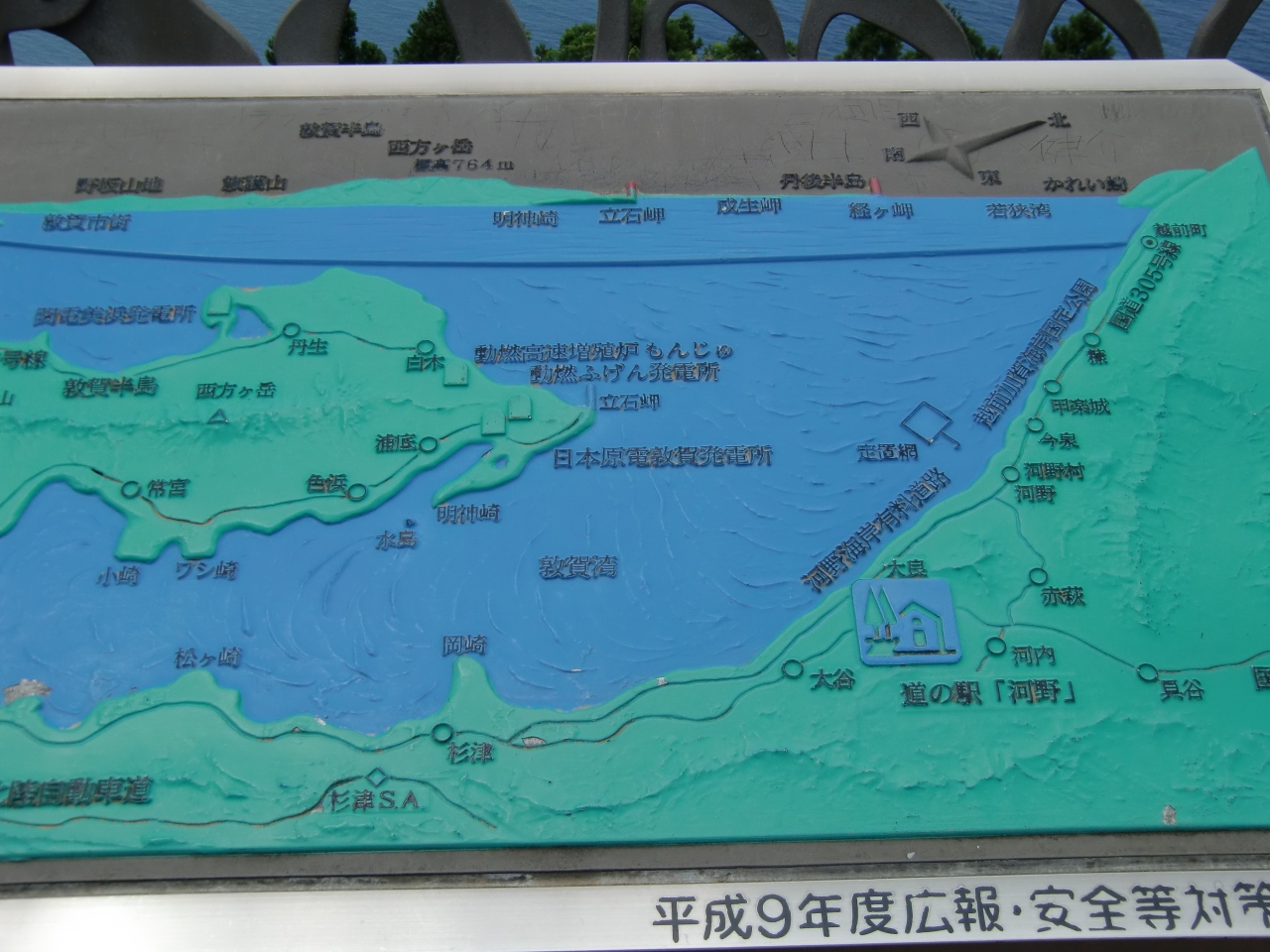 国道8号線の敦賀市から坂を登り始めていくつかトンネルを越えて南越前町に入った山間の高台に位置する「道の駅 河野」は敦賀湾から日本海が見渡せるビュースポットが自慢の道の駅です。