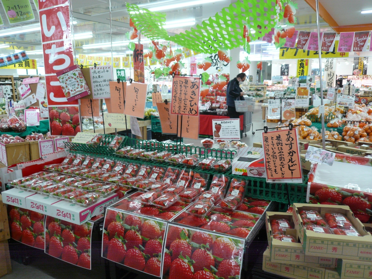 今回は時間がちょっと遅いので野菜などはほぼ売り切れ状態で種類も残って無いです~、正面の奈良特産の苺だけは充実した品揃えで甘い苺の香りが春の季節を感じさせます。