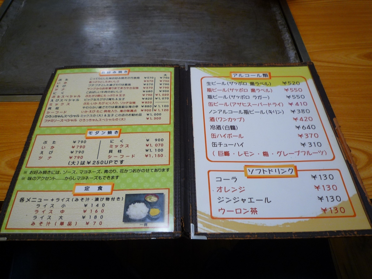 これだけで地元ではかなりの人気店だと言うことが判りますね…、メニューを見ながら何にするか?、関西では基本は豚玉で、+烏賊や海老か牛肉を入れたミックスなのか?。