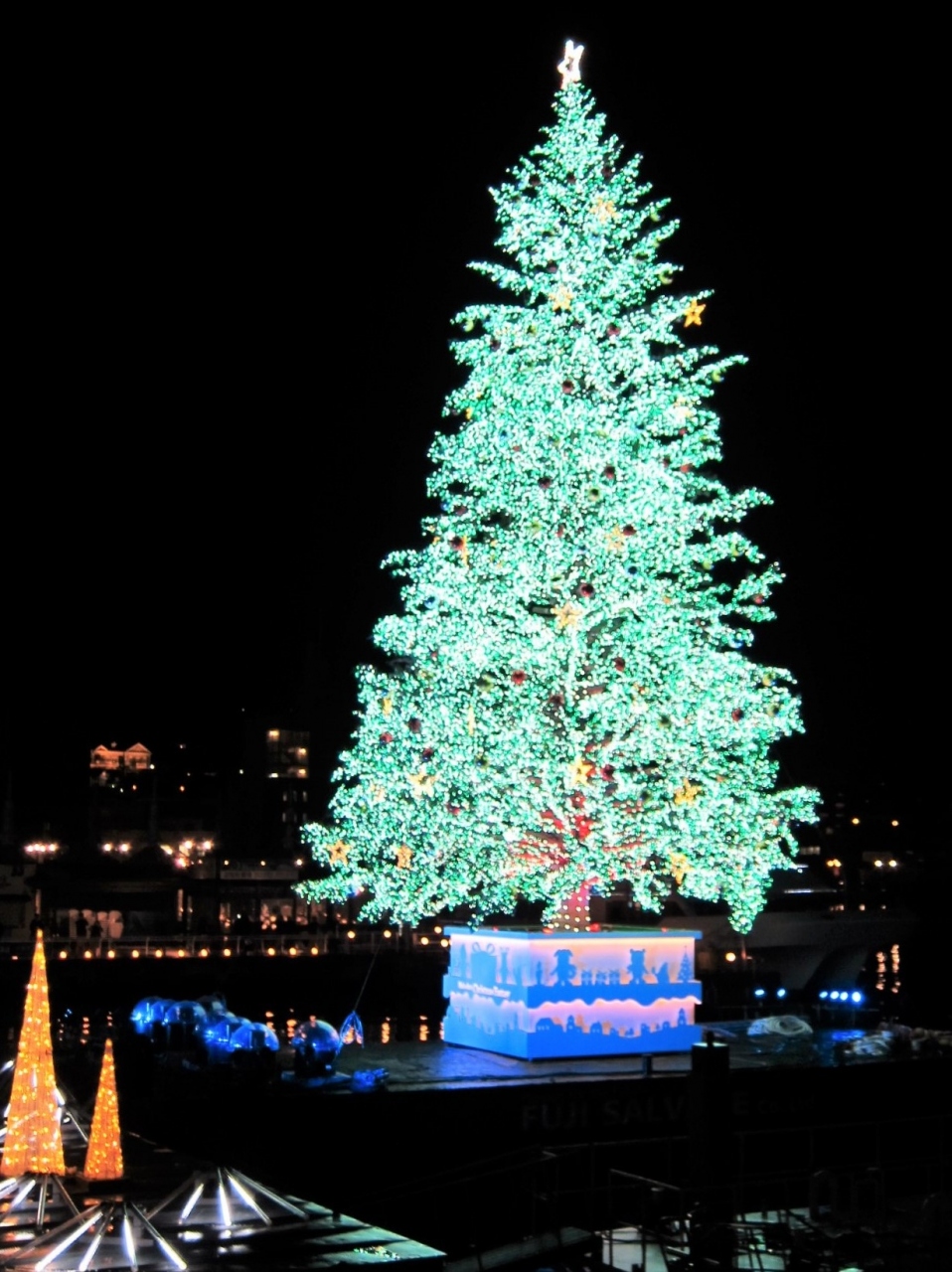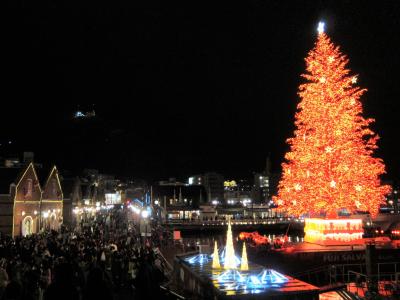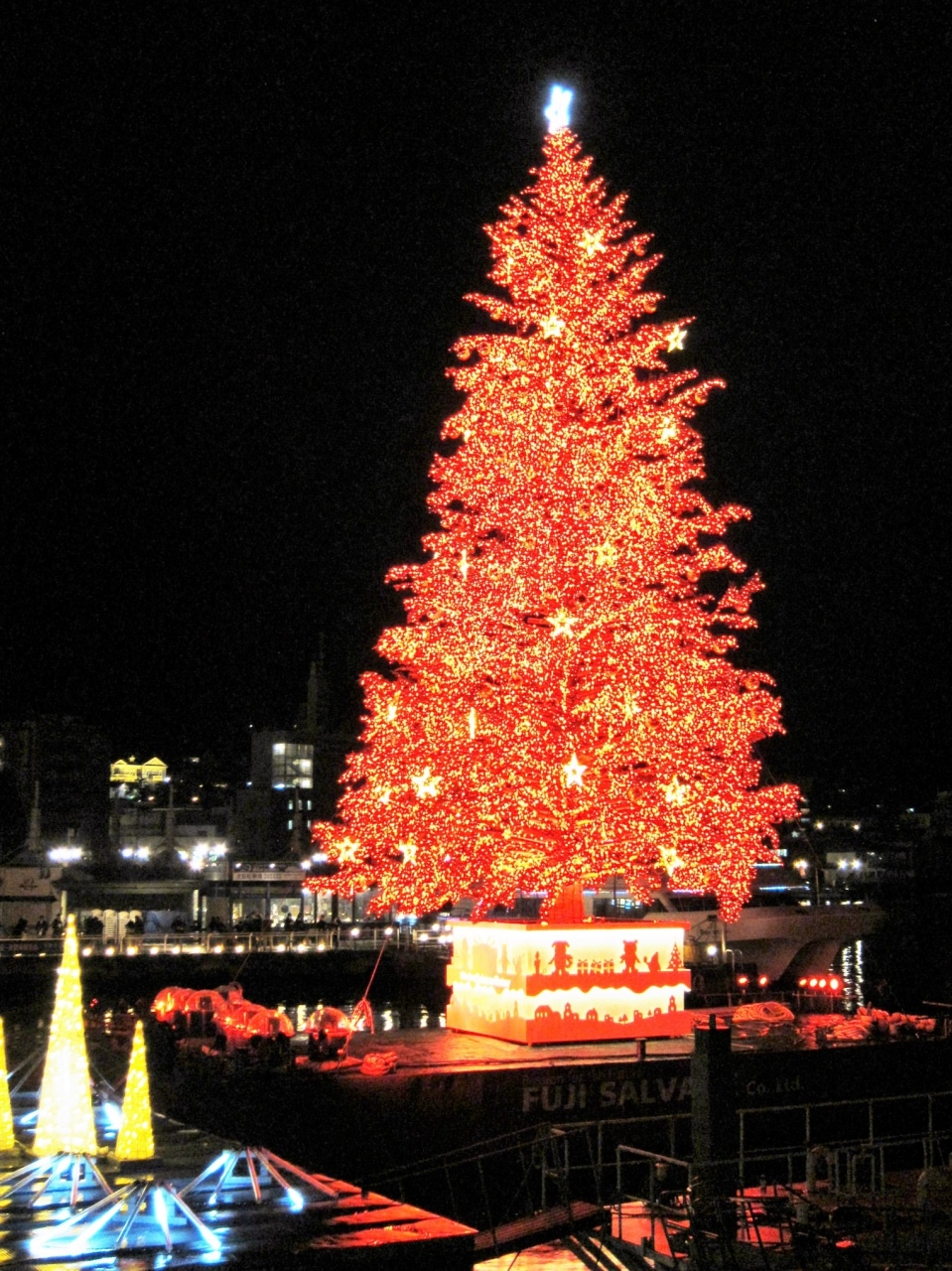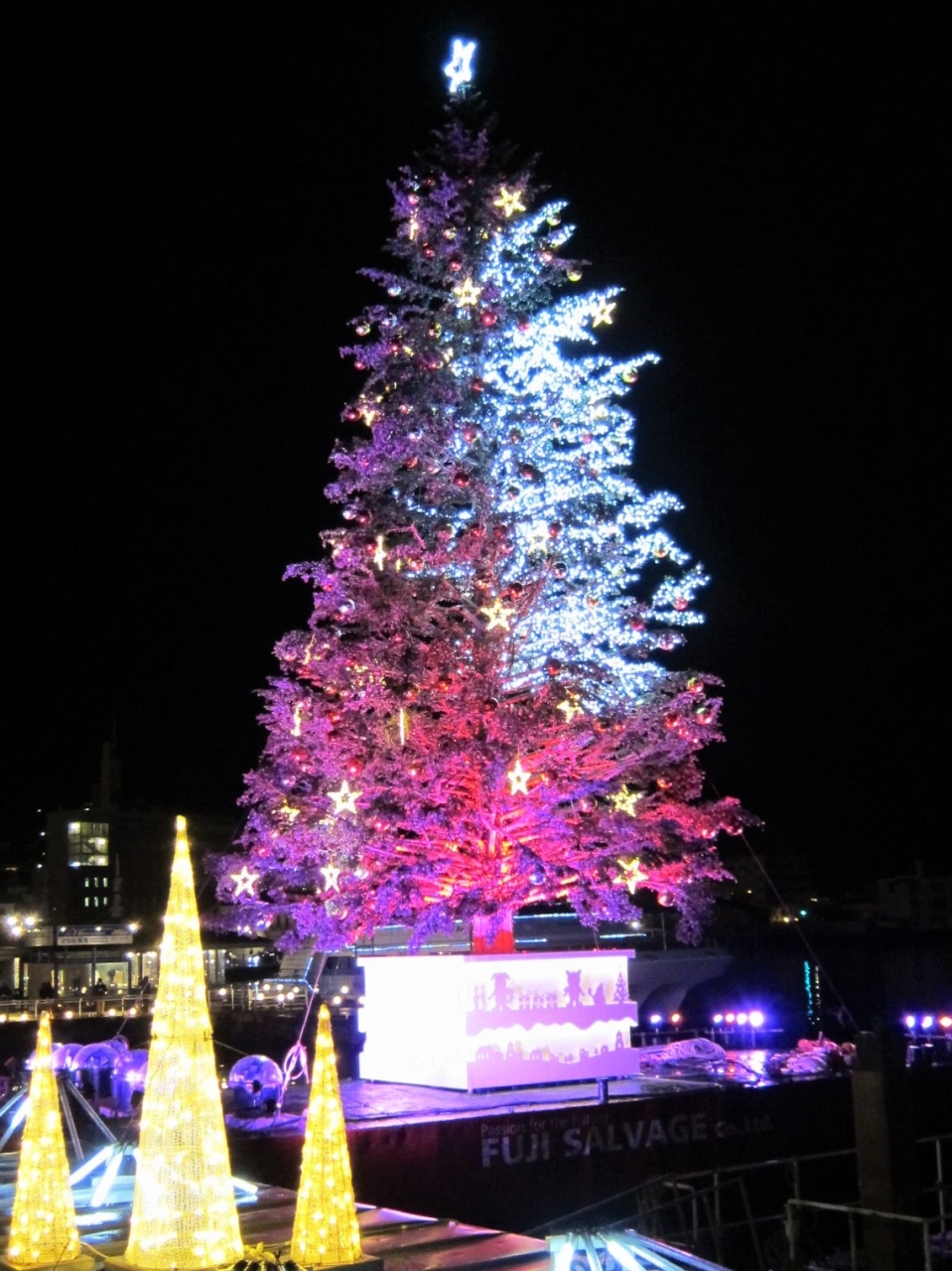 巨大なクリスマスツリーは姉妹都市カナダ・ハリファックス市から贈られたもみの木に15万個の電球が装飾されて洋上に浮かぶイルミネーションライトは一際美しいです。