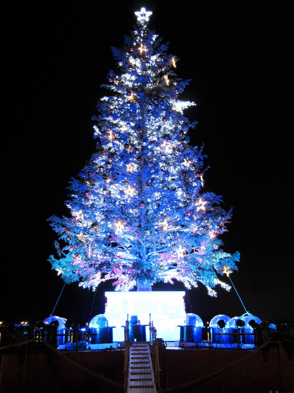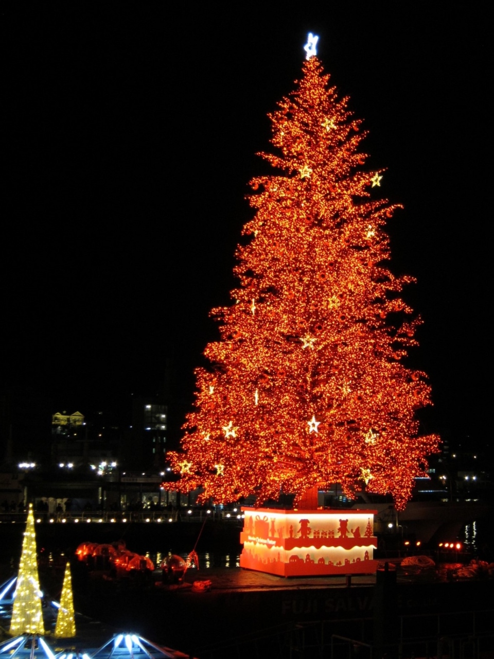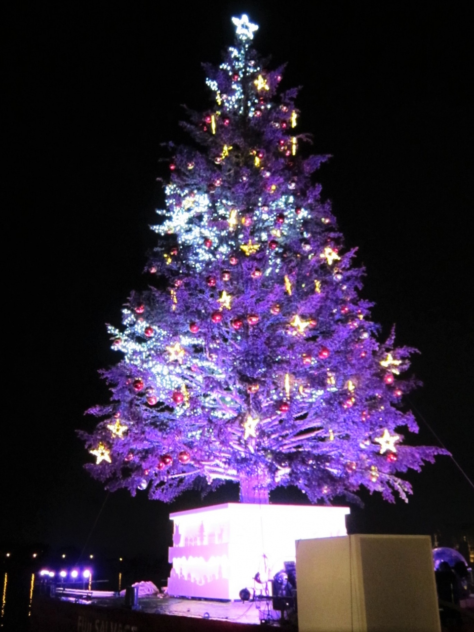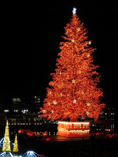 巨大なクリスマスツリーは姉妹都市カナダ・ハリファックス市から贈られたもみの木に15万個の電球が装飾されて洋上に浮かぶイルミネーションライトは一際美しいです。