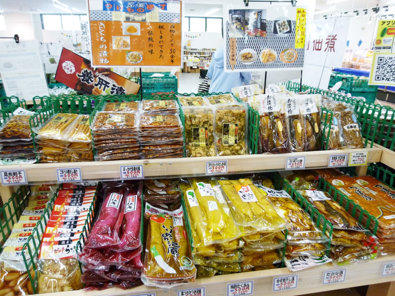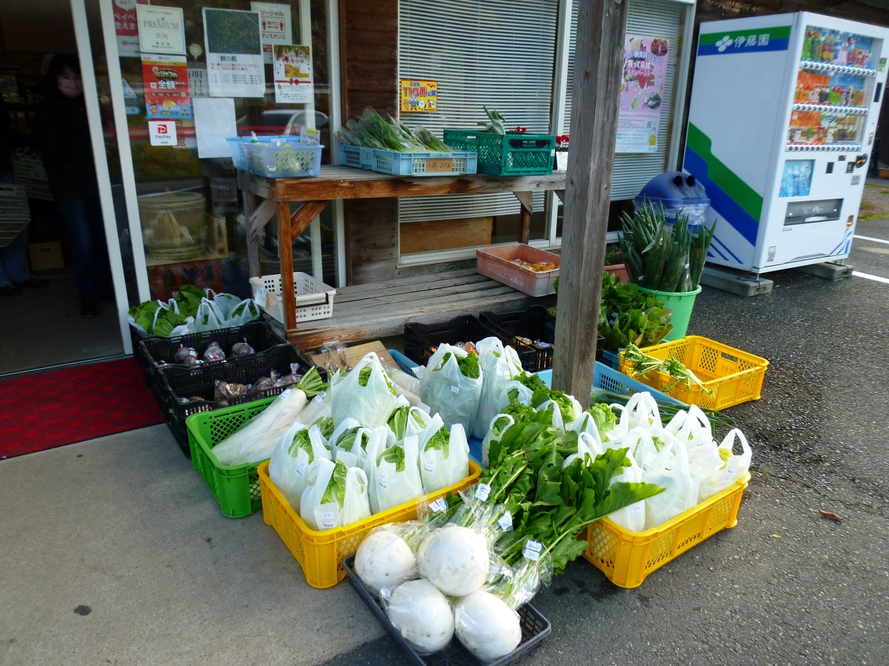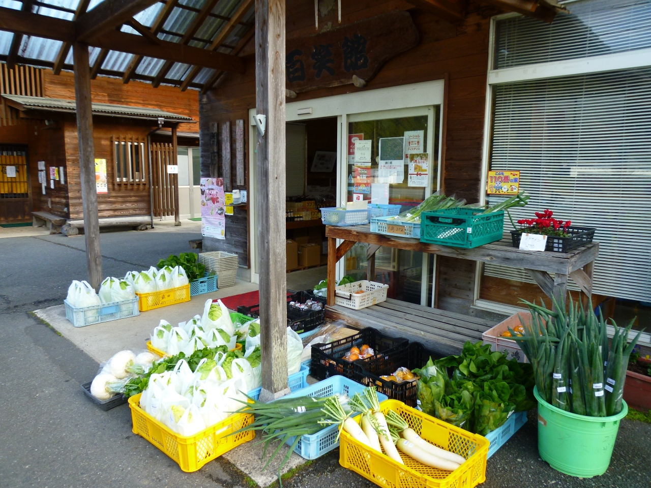 規模的にはコンパクトな道の駅なので販売所も同様です。木の棚にはその日に取れた野菜などが並べられてリーズナブルな価格で販売されてます。